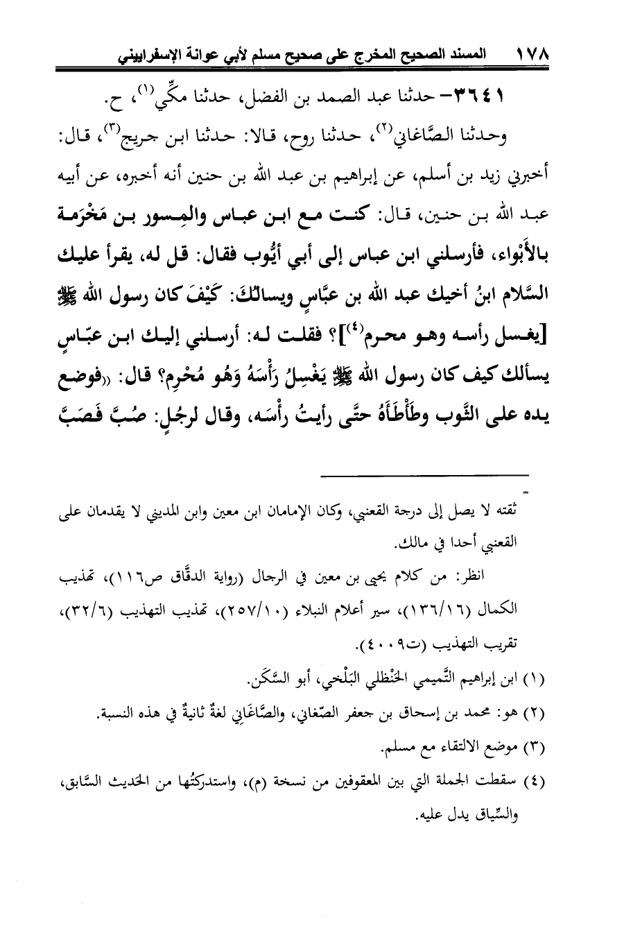 وحدثنا الصَّاغاني (¬2)، حدثنا روح، قالا: حدثنا ابن جريج (¬3)، قال: أخبرني زيد بن أسلم، عن إبراهيم بن عبد الله بن حنين أنه أخبره، عن أبيه عبد الله بن حنين، قال: كنت مع ابن عباس والمِسور بن مَخْرَمة بالأَبْواء، فأرسلني ابن عباس إلى أبي أيُّوب فقال: قل له، يقرأ عليك السَّلام ابنُ أخيك عبد الله بن عبَّاسٍ ويسألُكَ: كَيْفَ كان رسول الله -صلى الله عليه وسلم-[يغسل رأسه وهو محرم (¬4)]؟ فقلت له: أرسلني إليك ابن عبّاسٍ يسألك كيف كان رسول الله -صلى الله عليه وسلم- يَغْسِلُ رَأْسَهُ وَهُو مُحْرِم؟ قال: "فوضع يده على الثَّوب وطَأْطَأَهُ حتَّى رأيتُ رأْسَه، وقال لرجُلٍ: صُبَّ فَصَبَّ
