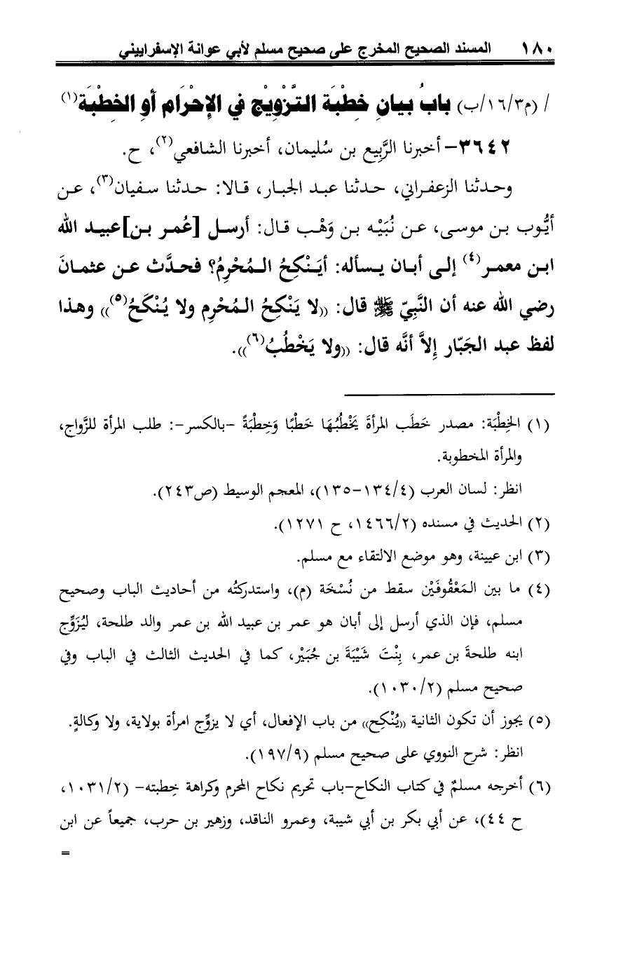 وحدثنا الزعفراني، حدثنا عبد الجبار، قالا: حدثنا سفيان (¬2)، عن أيُّوب بن موسى، عن نُبَيْه بن وَهْب قال: أرسل [عُمر بن] عبيد الله ابن معمر (¬3) إلى أبان يسأله: أيَنْكِحُ المُحْرِمُ؟ فحدَّث عن عثمانَ رضي الله عنه أن النَّبِيّ -صلى الله عليه وسلم- قال: "لا يَنْكِحُ المُحْرِم ولا يُنْكَحُ (¬4) " وهذا لفظ عبد الجَبّار إِلَّا أنَّه قال: "ولا يَخْطُبُ (¬5) ".
