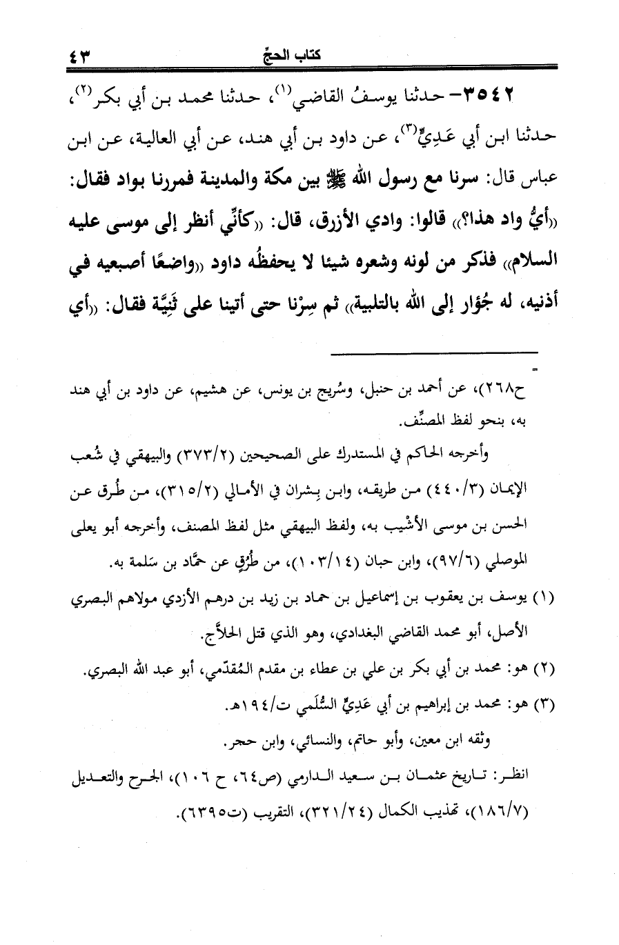 3542 - حدثنا يوسفُ القاضي (¬1)، حدثنا محمد بن أبي بكر (¬2)، حدثنا ابن أبي عَدِيٍّ (¬3)، عن داود بن أبي هند، عن أبي العالية، عن ابن عباس قال: سرنا مع رسول الله -صلى الله عليه وسلم- بين مكة والمدينة فمررنا بواد فقال: "أيُّ واد هذا؟ " قالوا: وادي الأزرق، قال: "كأنِّي أنظر إلى موسى عليه السلام" فذكر من لونه وشعره شيئًا لا يحفظُه داود "واضعًا أصبعيه في أذنيه، له جُؤار إلى الله بالتلبية" ثم سِرْنا حتى أتينا على ثَنِيَّة فقال: "أي