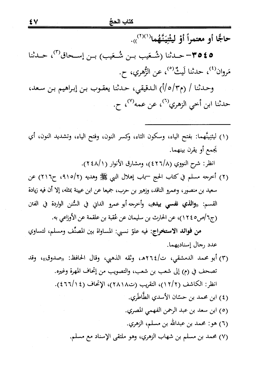 (¬9) الزهري ملتقى الإسناد مسلم، وقد أخرج مسلم هذا الحديث في كتاب الحج -باب إهلال النَّبيِّ -صلى الله عليه وسلم- وهديه- (2/ 915) عن قتيبة عن ليث، وعن حرملة، عن ابن وهب، عن يونس، كلاهما عن الزهري به، وأحال لفظه على حديث سفيان بن عيينة عن الزهري.