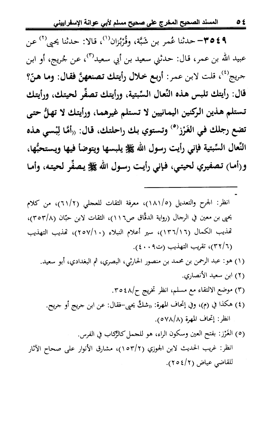 3549 - حدثنا عُمر بن شَبَّة، وقُرْبُزان (¬1)، قالا: حدثنا يحيى (¬2) عن عبيد الله بن عمر، قال: حدثني سعيد بن أبي سعيد (¬3)، عن جُريج، أو ابن جريج (¬4)، قلت لابن عمر: أربع خلال رأيتك تصنعهنَّ فقال: وما هنّ؟ قال: رأيتك تلبس هذه النِّعال السِّبتية، ورأيتك تصفِّر لحيتك، ورأيتك تستلم هذين الركنين اليمانيين لا تستلم غيرهما، ورأيتك لا تهلُّ حتى تضع رجلك في الغَرْز (¬5) وتستوي بك راحلتك، قال: "أمَّا لِبْسي هذه النِّعال السِّبتية فإني رأيت رسول الله -صلى الله عليه وسلم- يلبسها ويتوضأ فيها ويستحبُّها، و (أما) تصفيري لحيتي، فإني رأيت رسول الله -صلى الله عليه وسلم- يصفِّر لحيته، وأما