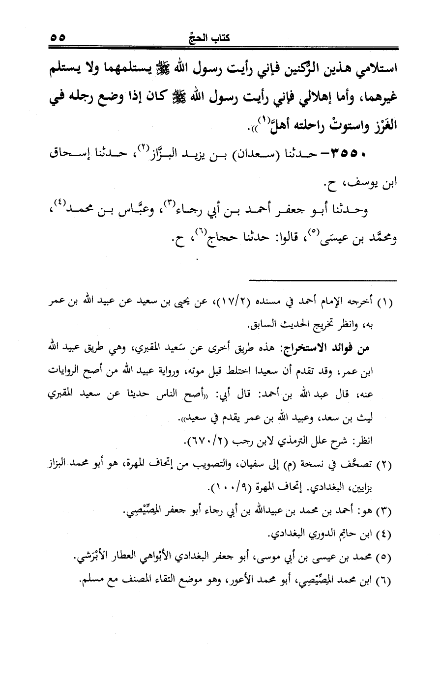 وحدثنا إبراهيم بن مرزوق (¬8)، حدثنا مكي (¬9)، كلهم عن ابن جريج (¬10) قال: أخبرني صالح بن كَيْسَان، عن نافع، عن ابن عمر أنه كان يخبرُ: "أنَّ النبِيّ -صلى الله عليه وسلم- أهلَّ حينَ استوتْ به راحلتُه قائمةً (¬11) ".