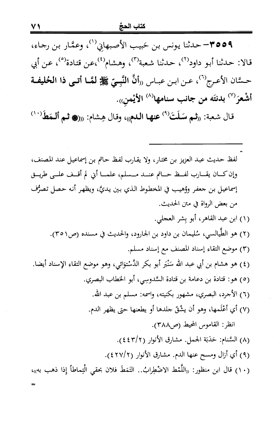 3559 - حدثنا يونس بن حَبيب الأصبهانِي (¬1)، وعمَّار بن رجاء، قالا: حدثنا أبو داود (¬2)، حدثنا شعبة (¬3)، وهشام (¬4)، عن قتادة (¬5)، عن أبي حسَّان الأعرج (¬6)، عن ابن عباس "أنَّ النَّبِيّ -صلى الله عليه وسلم- لمَّا أتى ذا الحُليفة أشْعرَ (¬7) بدنتَه من جانب سنامها (¬8) الأيْمنِ".