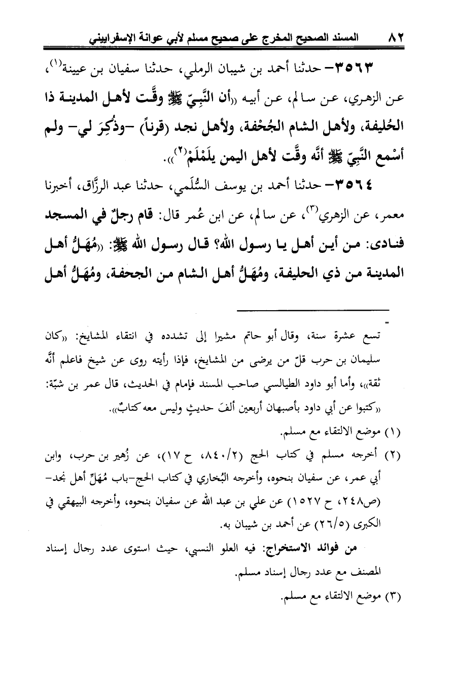 (¬2) أخرجه مسلم في كتاب الحج (2/ 840، ح 17)، عن زُهير بن حرب، وابن أبي عمر، عن سفيان بنحوه، وأخرجه البُخاري في كتاب الحج -باب مُهَلِّ أهل نجد- (ص 248، ح 1527) عن علي بن عبد الله عن سفيان بنحوه، وأخرجه البيهقي في الكبرى (5/ 26) عن أحمد بن شيبان به.