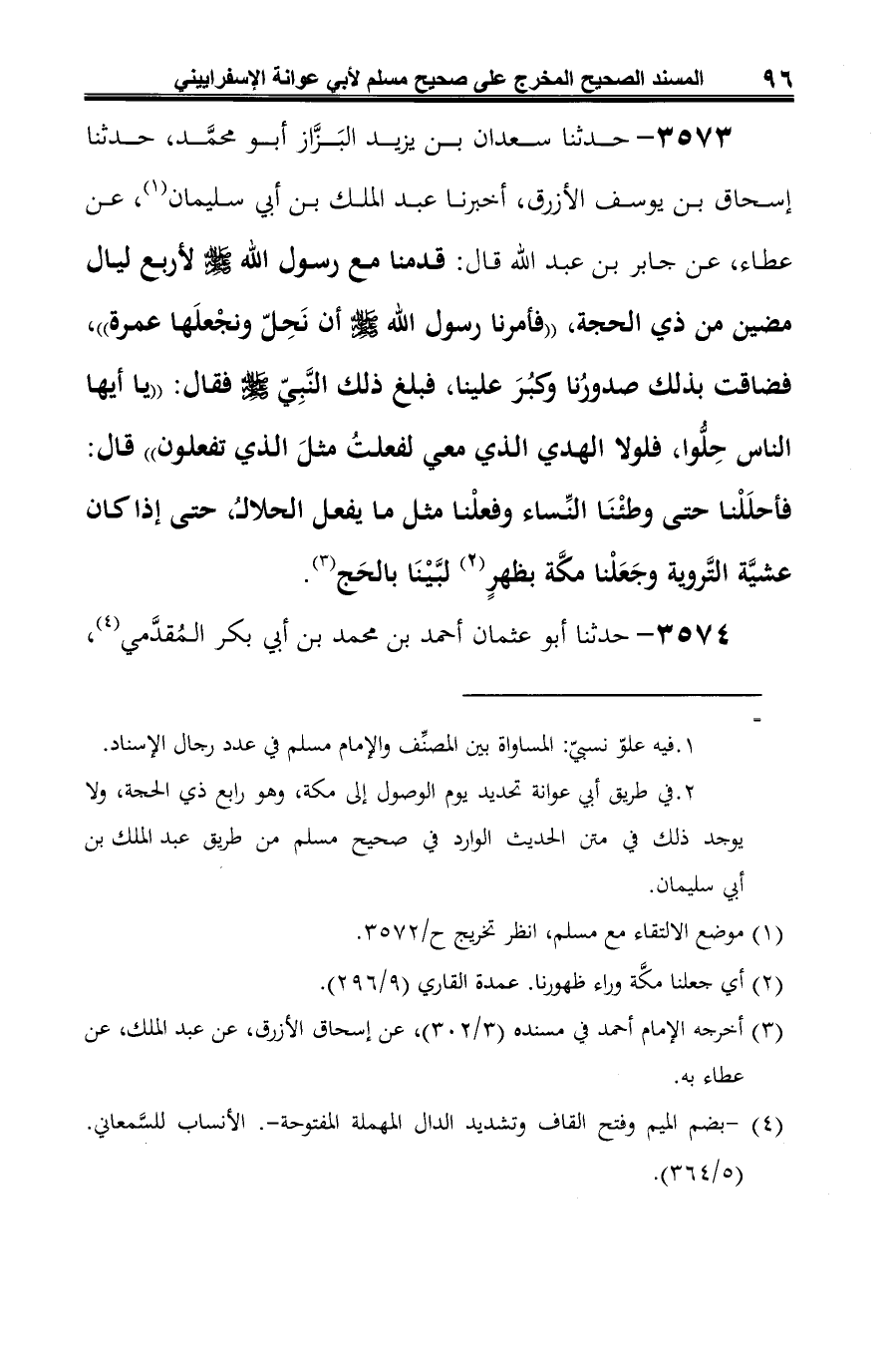-[97]- حدثنا سليمان بن حرب، وعارم (¬2)، وأبي (¬3)، ومُسَدَّد (¬4)، قالوا: حدَّثنا حمَّاد بن زيد (¬5)، عن أيُّوب، عن مجاهد، عن جابر قال: "قدِمنا مع رسول الله -صلى الله عليه وسلم- ونحن نقُولُ: لبَّيك بالحج، فأمرَنا فجعلناها عُمْرةً (¬6) ".