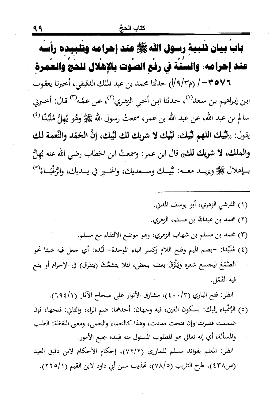 3576 - حدثنا محمد بن عبد الملك الدقيقي، أخبرنا يعقوب ابن إبراهيم بن سعد (¬1)، حدثنا ابن أخي الزهري (¬2)، عن عمِّه (¬3) قال: أخبرني سالم بن عبد الله، عن عبد الله بن عمر، سمعتُ رسول الله -صلى الله عليه وسلم- وهُو يُهِلُّ مُلَبِّدًا (¬4) يقول: "لبَّيك اللهم لبَّيك، لبَّيك لا شريك لك لبَّيك، إنَّ الحَمْد والنِّعمة لك والملك، لا شريك لك" قال ابن عمر: وسمعتُ ابن الخطاب رضي الله عنه يُهِلُّ بإهلال -صلى الله عليه وسلم- ويزيد معه: لبَّيك وسعديك، والخير في يديك، والرَّغْبَاءُ (¬5)