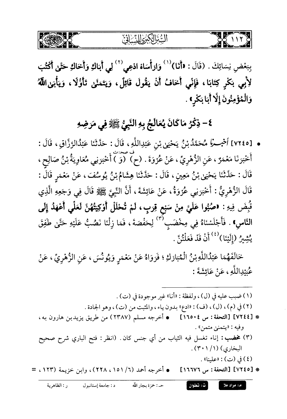 7245- أَخبَرنا مُحَمدُ بنُ يَحْيَى بنِ عَبدِ اللهِ، قَالَ: حَدَّثنا عَبدُ الرَّزَّاقِ، قَالَ: أَخبَرنا مَعْمَرٌ، عَنِ الزُّهْرِيِّ، عَن عُرْوَةَ (ح) وَأَخْبَرَنِي مُعاويَةُ بنُ صَالِحٍ، قَالَ: حَدَّثني يَحْيَى بنُ مَعِينٍ، قَالَ: حَدَّثنا هِشَامُ بنُ يُوسُفَ، عَن مَعْمَرٍ، قَالَ: قَالَ الزُّهْرِيُّ: أَخْبَرَنِي عُرْوَةُ، عَن عَائِشَةَ، أَنَّ النَّبيَّ صَلى الله عَلَيهِ وسَلم قَالَ فِي وَجَعِهِ الَّذِي قُبِضَ فِيهِ: صُبُّوا عَلَيَّ مِنْ سَبْعِ قِرَبٍ لَمْ تُحْلَلْ أَوْكِيَتُهُنَّ، لَعَلِّي أَعْهَدُ إِلَى النَّاسِ، فَأَجْلَسْنَاهُ فِي مِخْضَبٍ لِحَفْصَةَ، فَمَا زِلْنَا نَصُبُّ عَلَيْهِ حَتَّى طَفِقَ يُشِيرُإلَيْنَا أَنْ قَدْ فَعَلْتُنَّ.