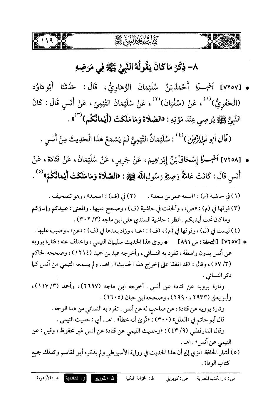 7257- أَخبَرنا أَحْمَدُ بنُ سُلَيْمَانَ الرُّهَاوِيُّ، قَالَ: حَدَّثنا أَبو دَاوُدَ الحَفَرِيُّ، عَن سُفيانَ، عَن سُلَيْمَانَ التَّيْمِيِّ، عَن أَنَسٍ، قَالَ: كَانَ النَّبيُّ صَلى الله عَلَيهِ وسَلم يُوصِي عِنْدَ مَوْتِهِ: الصَّلاةَ وَمَا مَلَكَتْ أَيْمَانُكُمْ.
