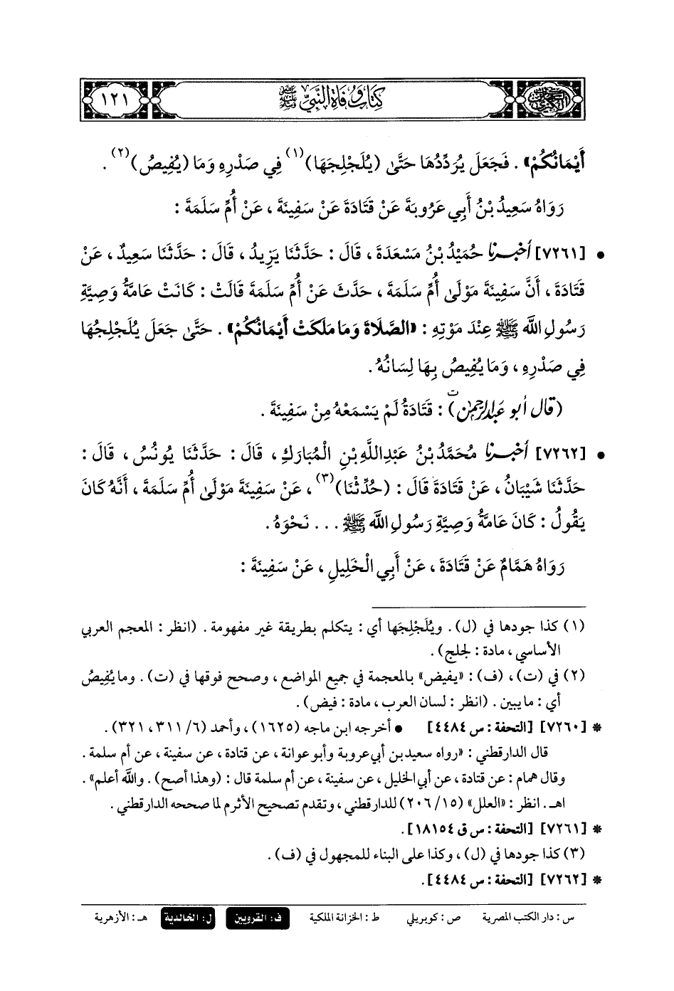 7261- أَخبَرنا حُمَيْدُ بنُ مَسْعَدَةَ، قَالَ: حَدَّثنا يَزِيدُ، قَالَ: حَدَّثنا سَعِيدٌ، عَن قَتَادَةَ، أَنَّ سَفِينَةَ، مَوْلَى أُمِّ سَلَمَةَ حَدَّثَ عَنِ أُمِّ سَلَمَةَ قَالَتْ: كَانَتْ عَامَّةُ وَصِيَّةِ رَسُولِ اللهِ صَلى الله عَلَيهِ وسَلم عِنْدَ مَوْتِهِ: الصَّلاةَ وَمَا مَلَكَتْ أَيْمَانُكُمْ، حَتَّى جَعَلَ يُلَجْلِجُهَا فِي صَدْرِهِ وَمَا يَفِيضُ بِهَا لِسَانُهُ.