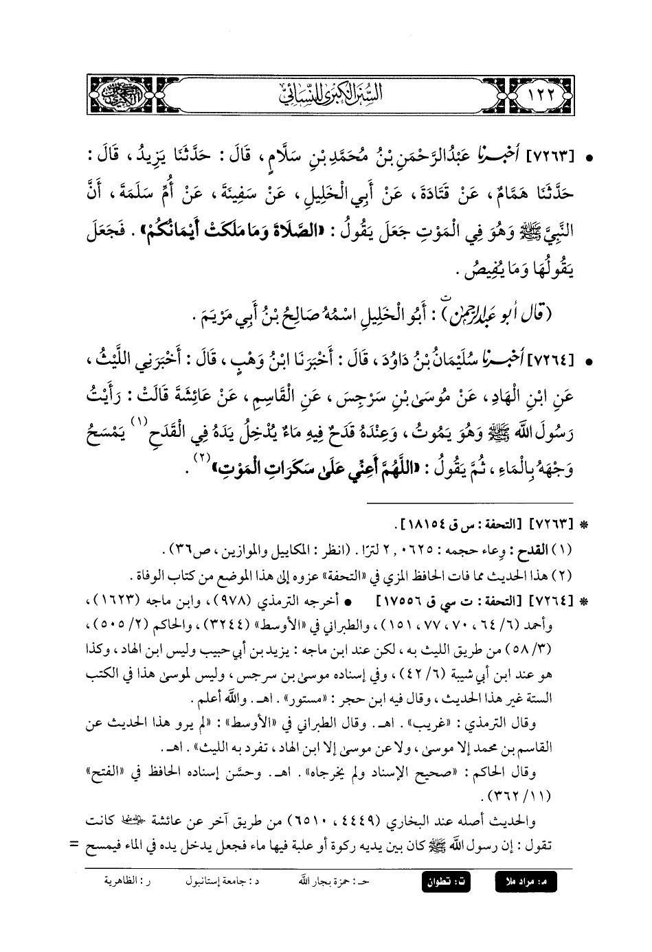 7264- أَخبَرنا سُلَيْمَانُ بنُ دَاوُدَ، قَالَ: أَخبَرنا ابْنُ وَهْبٍ، قَالَ: أَخْبَرَنِي اللَّيْثُ، عَنِ ابْنِ الهَادِ، عَن مُوسَى بنِ سَرْجِسَ، عَنِ القَاسِمِ، عَن عَائِشَةَ قَالَتْ: رَأَيْتُ رَسُولَ اللهِ صَلى الله عَلَيهِ وسَلم وَهُوَ يَمُوتُ، وَعِنْدَهُ قَدَحٌ فِيهِ مَاءٌ يُدْخِلُ يَدَهُ فِي القَدَحِ يَمْسَحُ وَجْهَهُ بِالمَاءِ، ثُمَّ يَقُولُ: اللهُمَّ أَعِنِّي عَلَى سَكَرَاتِ المَوْتِ.