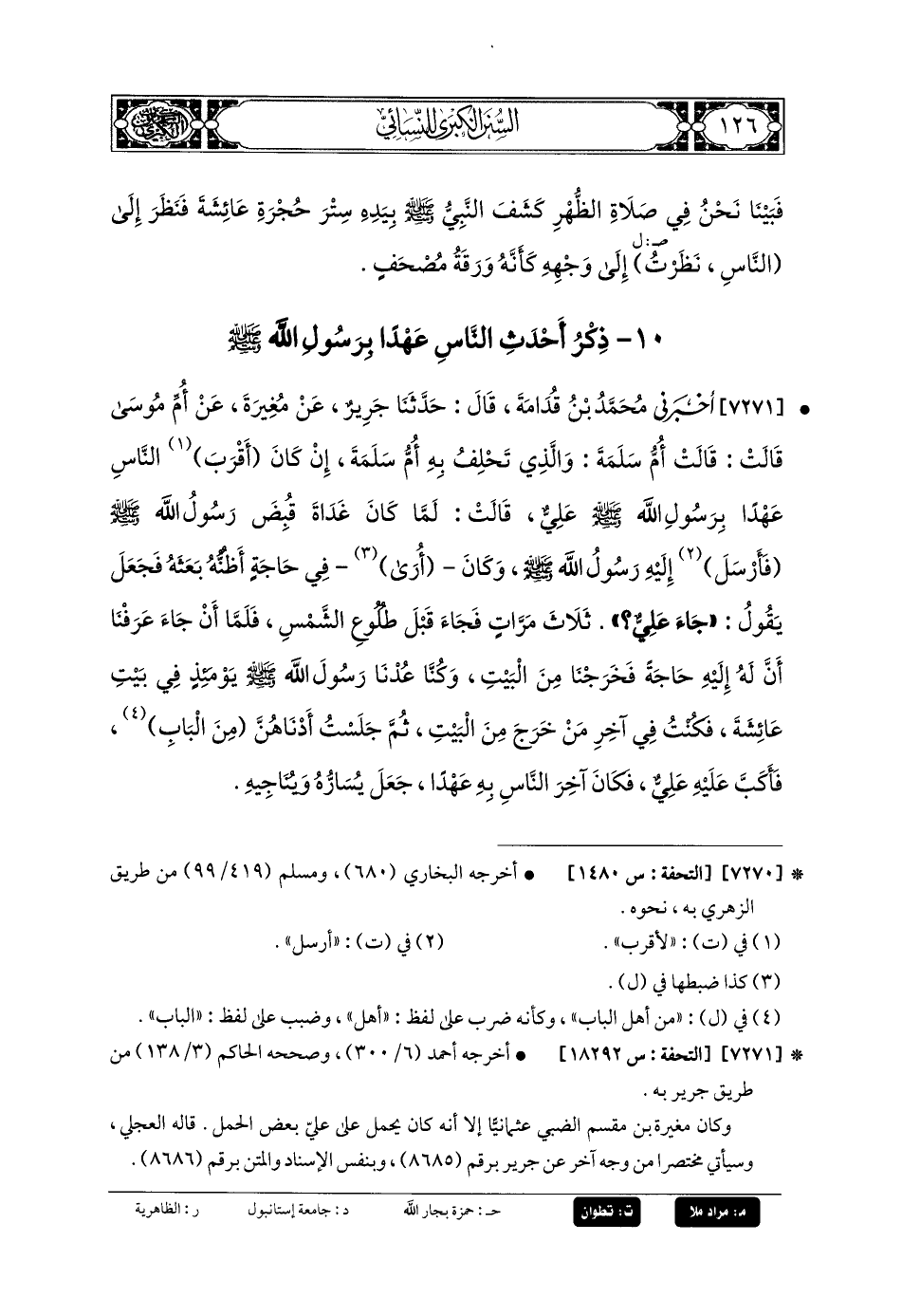 7271- أَخبَرني مُحَمدُ بنُ قُدَامَةَ، قَالَ: حَدَّثنا جَرِيرٌ، عَنِ مُغِيرَةَ، عَن أُمِّ مُوسَى، قَالَتْ: قَالَتْ أُمُّ سَلَمَةَ: وَالَّذِي تَحْلِفُ بِهِ أُمُّ سَلَمَةَ، إِنْ كَانَ أَقْرَبَ النَّاسِ عَهْدًا بِرَسُولِ اللهِ صَلى الله عَلَيهِ وسَلم عَليٌّ، قَالَتْ: لَمَّا كَانَ غَدَاةَ قُبِضَ رَسُولُ اللهِ صَلى الله عَلَيهِ وسَلم، فَأَرْسَلَ إِلَيْهِ رَسُولُ اللهِ صَلى الله عَلَيهِ وسَلم، وَكَأَنْ أُرَى فِي حَاجَةٍ أَظُنُّهُ بَعَثَهُ، فَجَعَلَ يَقُولُ: جَاءَ عَليٌّ؟ ثَلاثَ مَرَّاتٍ، فَجَاءَ قَبْلَ طُلُوعِ الشَّمْسِ، فَلَمَّا أَنْ جَاءَ عَرَفْنَا أَنَّ لَهُ إِلَيْهِ حَاجَةً، فَخَرَجْنَا مِنَ البَيْتِ، وَكُنَّا عُدْنَا رَسُولَ اللهِ صَلى الله عَلَيهِ وسَلم يَوْمَئِذٍ فِي بَيْتِ عَائِشَةَ، فَكُنْتُ فِي آخِرِ مَنْ خَرَجَ مِنَ البَيْتِ، ثُمَّ جَلَسْتُ أَدْنَاهُنَّ مِنَ البَابِ، فَأَكَبَّ عَلَيْهِ عَليٌّ، فَكَانَ آخِرَ النَّاسِ بِهِ عَهْدًا جَعَلَ يُسَارُّهُ وَيُنَاجِيهِ.