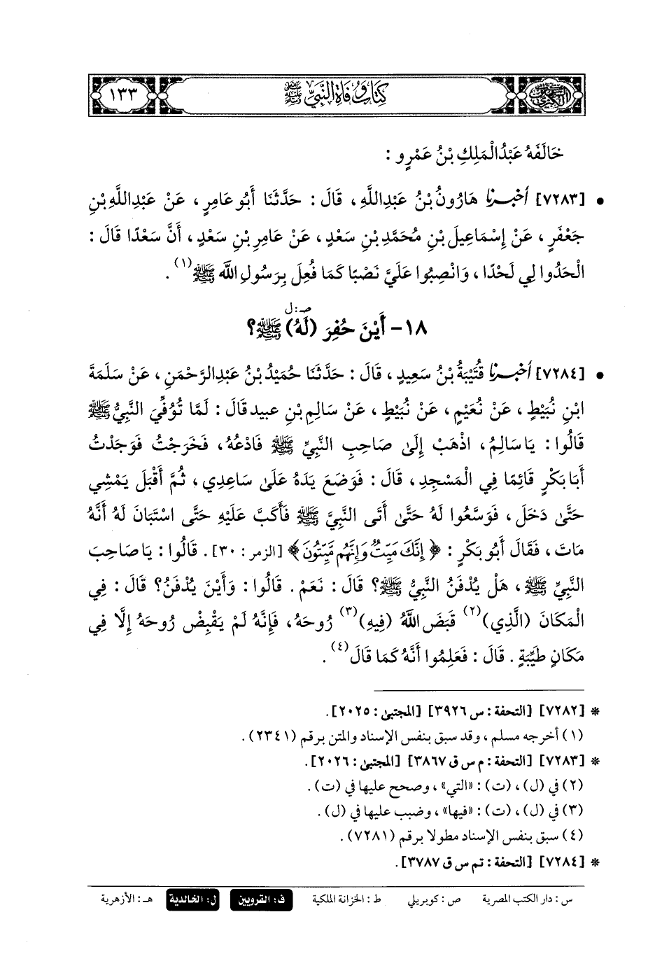 7284- أَخبَرنا قُتَيبَةُ بنُ سَعِيدٍ، قَالَ: حَدَّثنا حُمَيْدُ بنُ عَبدِ الرَّحمَنِ، عَن سَلَمَةَ بنِ نُبَيْطٍ، عَن نُعَيْمٍ، عَن نُبَيْطٍ، عَن سَالِمِ بنِ عُبَيْدٍ، قَالَ: لَمَّا تُوُفِّيَ النَّبيُّ صَلى الله عَلَيهِ وسَلم قَالُوا: يَا سَالِمُ، اذْهَبْ إِلَى صَاحِبِ النَّبيِّ صَلى الله عَلَيهِ وسَلم فَادْعُهُ، فَخَرَجْتُ، فَوَجَدْتُ أَبَا بَكْرٍ قَائِمًا فِي المَسْجِدِ قَالَ: فَوَضَعَ يَدَهُ عَلَى سَاعِدَيْ، ثُمَّ أَقْبَلَ يَمْشِي حَتَّى دَخَلَ فَوَسَّعُوا لَهُ حَتَّى أَتَى النَّبيَّ صَلى الله عَلَيهِ وسَلم، فَأَكَبَّ عَلَيْهِ حَتَّى اسْتَبَانَ لَهُ أَنَّهُ مَاتَ، فَقَالَ أَبو بَكْرٍ: {إِنَّكَ مَيِّتٌ وَإِنَّهُمْ مَيِّتُونَ} قَالُوا: يَا صَاحِبَ النَّبيِّ صَلى الله عَلَيهِ وسَلم، هَلْ يُدْفَنُ النَّبيُّ صَلى الله عَلَيهِ وسَلم؟ قَالَ: نَعَمْ، قَالُوا: وَأَيْنَ يُدْفَنُ؟ قَالَ: فِي المَكَانِ الَّذِي قَبَضَ اللهُ فِيهِ رُوحَهُ، فَإِنَّهُ لَمْ يَقْبِضْ رُوحَهُ إِلاَّ فِي مَكَانٍ طَيِّبَةٍ، قَالَ: فَعَلِمَوا أَنَّهُ كَمَا قَالَ.