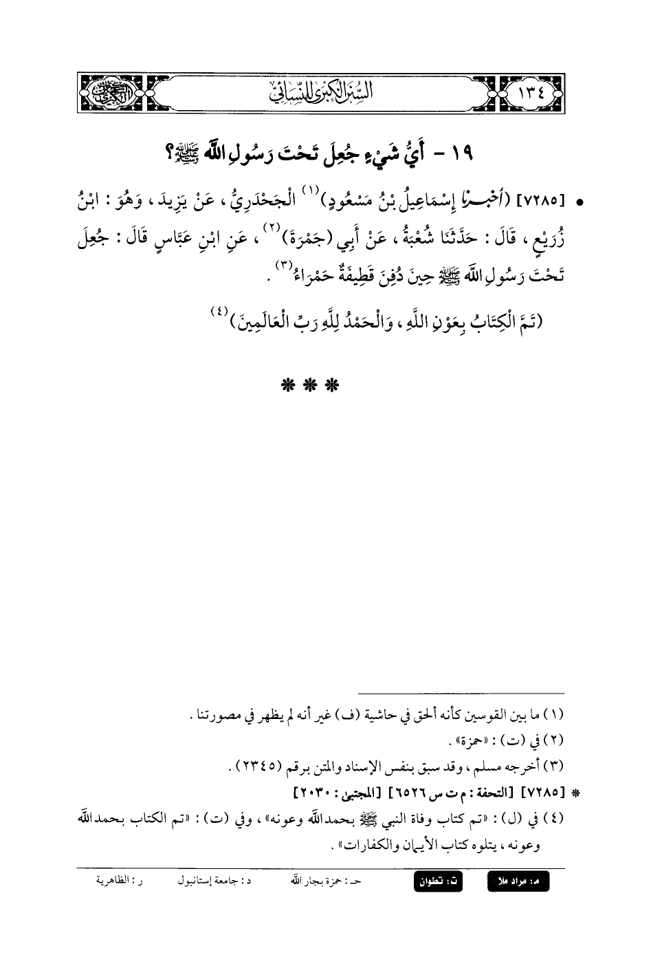 7285 - أَخبَرنا إِسمَاعِيلُ بنُ مَسْعُودٍ الجَحْدَرِيُّ، عَن يَزِيدَ، وَهُوَ ابْنُ زُرَيْعٍ، قَالَ: حَدَّثنا شُعْبَةُ، عَن أَبي جَمرَةَ، عَنِ ابْنِ عَبَّاسٍ، قَالَ: جُعِلَ تَحْتَ رَسُولِ اللهِ صَلى الله عَلَيهِ وسَلم حِينَ دُفِنَ قَطِيفَةٌ حَمْرَاءُ.
