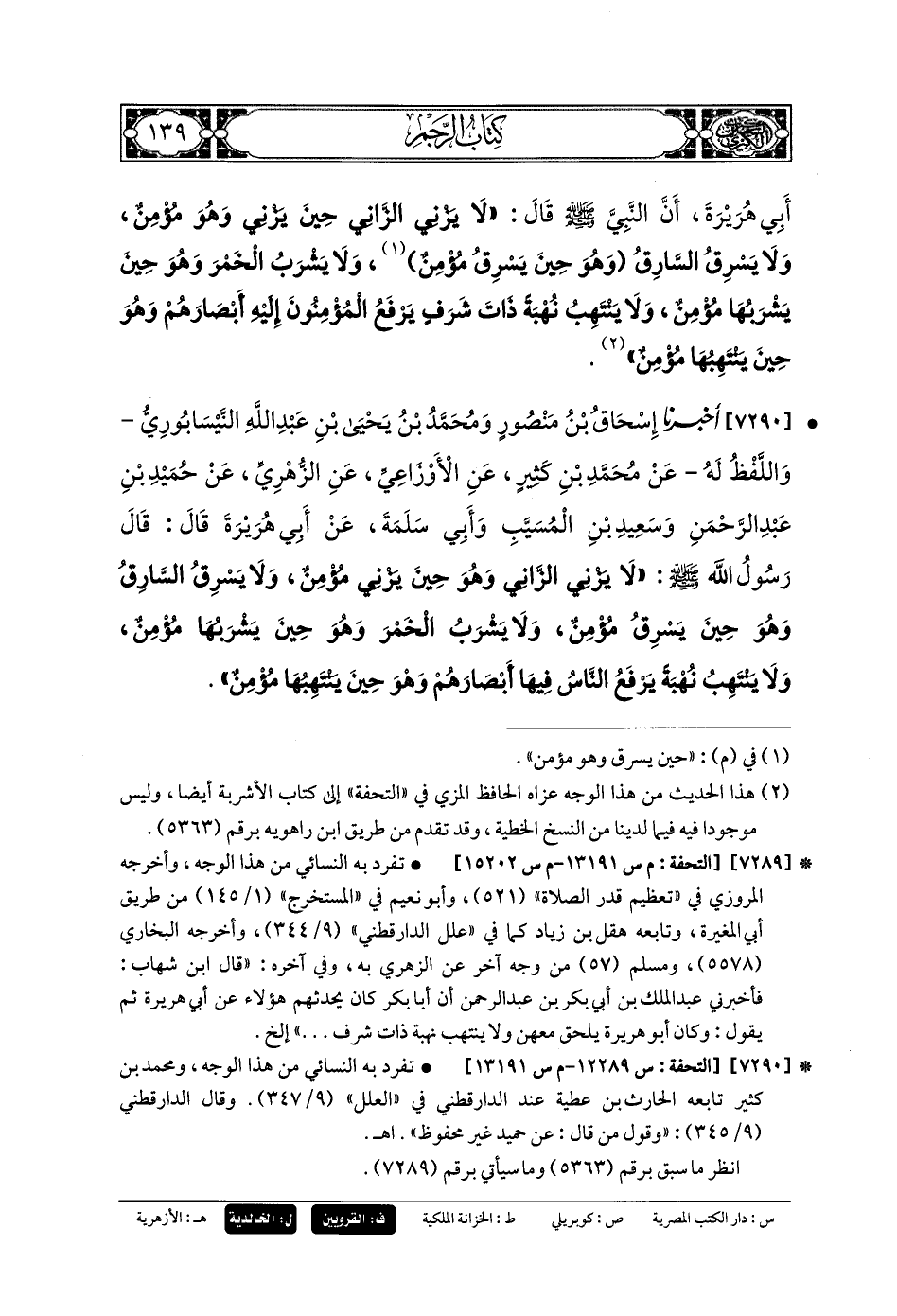 7290- أَخبَرنا إِسحَاقُ بنُ مَنْصُورٍ، وَمُحَمدُ بنُ يَحْيَى بنِ عَبدِ اللهِ النَّيْسَابُورِيُّ، وَاللَّفْظُ لَهُ، عَن مُحَمدِ بنِ كَثِيرٍ، عَنِ الأَوْزَاعِيِّ، عَنِ الزُّهْرِيِّ، عَن حُمَيْدِ بنِ عَبدِ الرَّحمَنِ، وَسَعِيدِ بنِ المُسَيَّبِ، وَأَبي سَلَمَةَ، عَن أَبي هُرَيْرَةَ، قَالَ: قَالَ رَسُولُ اللهِ صَلى الله عَلَيهِ وسَلم: لا يَزْنِي الزَّانِي وَهُوَ حِينَ يَزْنِي مُؤْمِنٌ، وَلا يَسْرِقُ السَّارِقُ وَهُوَ حِينَ يَسْرِقُ مُؤْمِنٌ، وَلا يَشْرَبُ الخَمْرَ وَهُوَ حِينَ يَشْرَبُهَا مُؤْمِنٌ، وَلا يَنْتَهِبُ نُهْبَةً يَرْفَعُ النَّاسُ فِيهَا أَبْصَارَهُمْ وَهُوَ حِينَ يَنْتَهِبُهَا مُؤْمِنٌ.