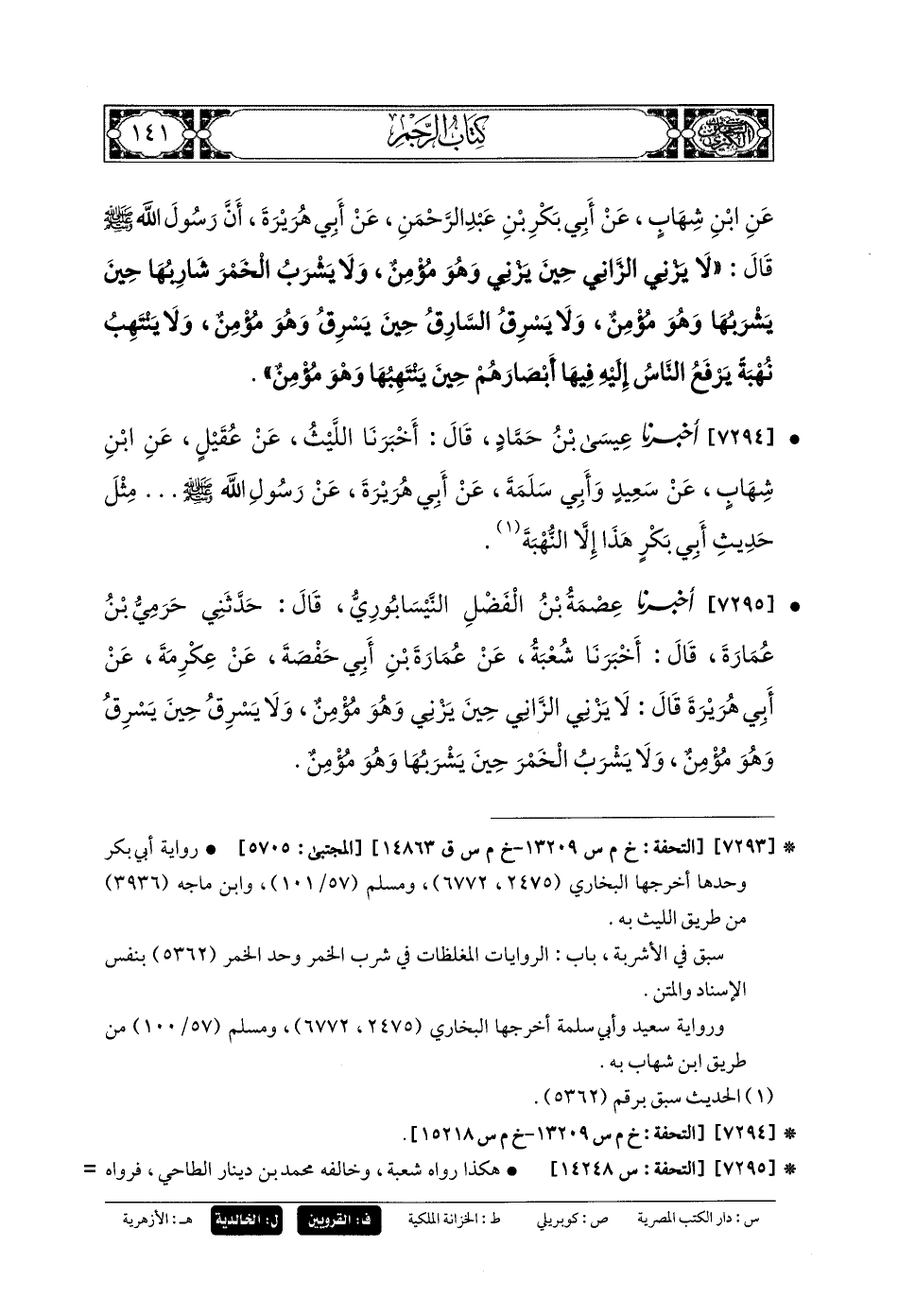 7295- أَخبَرنا عِصْمَةُ بنُ الفَضْلِ النَّيْسَابُورِيُّ، قَالَ: حَدَّثني حَرَمِيُّ بنُ عُمَارَةَ، قَالَ: أَخبَرنا شُعْبَةُ، عَن عُمَارَةَ بنِ أَبي حَفْصَةَ، عَن عِكْرِمَةَ، عَن أَبي هُرَيْرَةَ، قَالَ: لا يَزْنِي الزَّانِي حِينَ يَزْنِي وَهُوَ مُؤْمِنٌ، وَلا يَسْرِقُ حِينَ يَسْرِقُ وَهُوَ مُؤْمِنٌ، وَلا يَشْرَبُ الخَمْرَ حِينَ يَشْرَبُهَا وَهُوَ مُؤْمِنٌ.