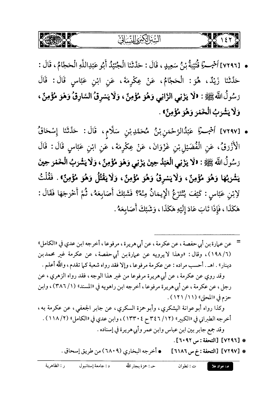 7297- أَخبَرنا عَبدُ الرَّحمَنِ بنُ مُحَمدِ بنِ سَلاَّمٍ، قَالَ: حَدَّثنا إِسحَاقُ الأَزْرَقُ، عَنِ الفُضَيْلِ بنِ غَزْوَانَ، عَن عِكْرِمَةَ، عَنِ ابْنِ عَبَّاسٍ، قَالَ: قَالَ رَسُولُ اللهِ صَلى الله عَلَيهِ وسَلم: لا يَزْنِي العَبدُ حِينَ يَزْنِي وَهُوَ مُؤْمِنٌ، وَلا يَشْرَبُ الخَمْرَ حِينَ يَشْرَبُهَا وَهُوَ مُؤْمِنٌ، وَلا يَسْرِقُ وَهُوَ مُؤْمِنٌ، وَلا يَقْتُلُ وَهُوَ مُؤْمِنٌ، فَقُلْتُ لاِبْنِ عَبَّاسَ: كَيْفَ يُنْتَزَعُ الإِيمَانُ مِنْهُ؟ فَشَبَّكَ أَصَابِعَهُ، ثُمَّ أَخْرَجَهَا، فَقَالَ: هَكَذَا، فَإِذَا تَابَ عَادَ إِلَيْهِ هَكَذَا، وَشَبَّكَ أَصَابِعَهَ.