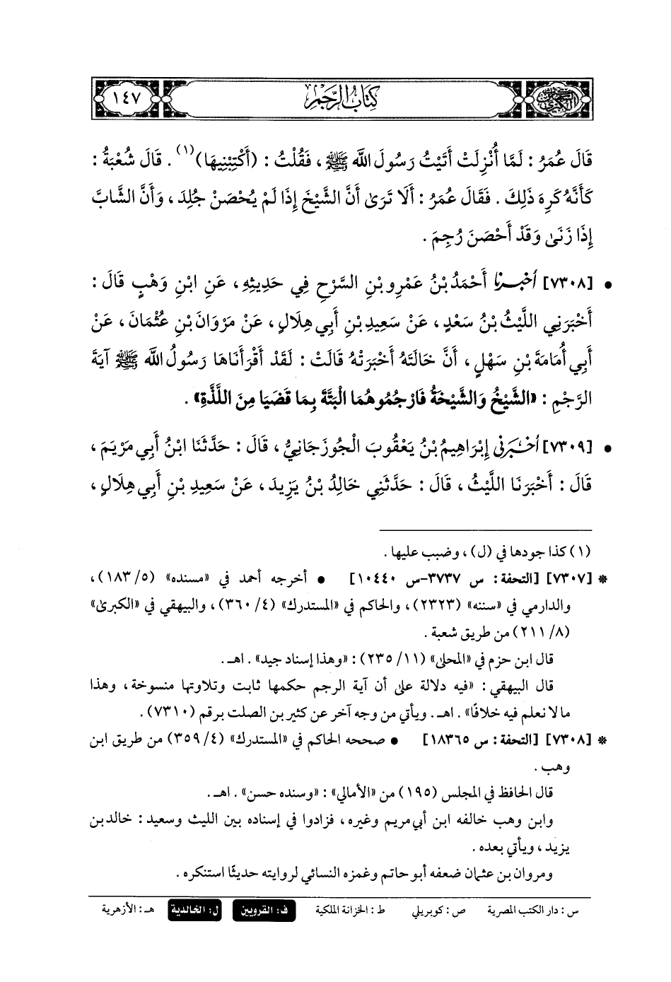 7308- أَخبَرنا أَحْمَدُ بنُ عَمْرِو بنِ السَّرْحِ فِي حَدِيثِهِ عَنِ ابْنِ وَهْبٍ، قَالَ: أَخْبَرَنِي اللَّيْثُ بنُ سَعْدٍ، عَن سَعِيدِ بنِ أَبي هِلالٍ، عَن مَرْوَانَ بنِ عُثْمَانَ، عَن أَبي أُمَامَةَ بنِ سَهْلٍ، أَنَّ خَالَتَهُ أَخْبَرَتْهُ قَالَتْ: لَقَدْ أَقَرَأَنَاهَا رَسُولُ اللهِ صَلى الله عَلَيهِ وسَلم آيَةَ الرَّجْمِ: الشَّيْخُ وَالشَّيْخَةُ فَارْجُمُوهُمَا البَتَّةَ بِمَا قَضَيَا مِنَ اللَّذَّةِ.