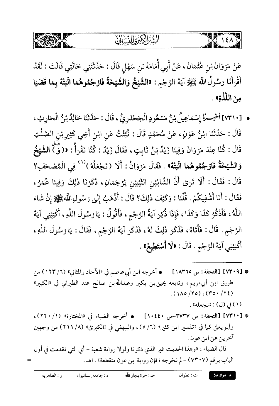 7310- أَخبَرنا إِسمَاعِيلُ بنُ مَسْعُودٍ الجَحْدَرِيُّ، قَالَ: حَدَّثنا خَالِدُ بنُ الحَارِثِ، قَالَ: حَدَّثنا ابْنُ عَوْنٍ، عَن مُحَمدٍ، قَالَ: نُبِّئْتُ عَنِ ابْنِ أَخِي كَثِيرِ بنِ الصَّلْتِ، قَالَ: كُنَّا عِنْدَ مَرْوَانَ وَفِينَا زَيْدُ بنُ ثَابِتٍ، فَقَالَ زَيْدٌ: كُنَّا نَقْرَأُ: الشَّيْخُ وَالشَّيْخَةُ فَارْجُمُوهُمَا البَتَّةَ، فَقَالُ مَرْوَانُ: أَلا تَجْعَلْهُ فِي المُصْحَفِ؟ قَالَ: فَقَالَ: أَلا تَرَى أَنَّ الشَّابَّيْنِ الثَّيَّبِيَنِ يُرْجَمَانِ؟ ذَكَرْنَا ذَلِكَ وَفِينَا عُمَرُ، فَقَالَ: أَنَا أَشْفِيكُمْ، قُلْنَا: وَكَيْفَ ذَلِكَ؟ قَالَ: أَذْهَبُ إِلَى رَسُولِ اللهِ صَلى الله عَلَيهِ وسَلم إِنْ شَاءَ اللهُ فَأَذْكُرُ كَذَا وَكَذَا، فَإِذَا ذُكِرَ أَيَّةَ الرَّجْمِ فَأَقُولُ: يَا رَسُولَ اللهِ، أَكْتِبْنِي آيَةَ الرَّجْمِ، قَالَ: فَأَتَاهُ فَذَكَرَ ذَلِكَ لَهُ، فَذَكَرَ آيَةَ الرَّجْمِ، فَقَالَ: يَا رَسُولَ اللهِ، أَكْتِبْنِي آيَةَ الرَّجْمِ، قَالَ: لا أَسْتَطِيعُ.
