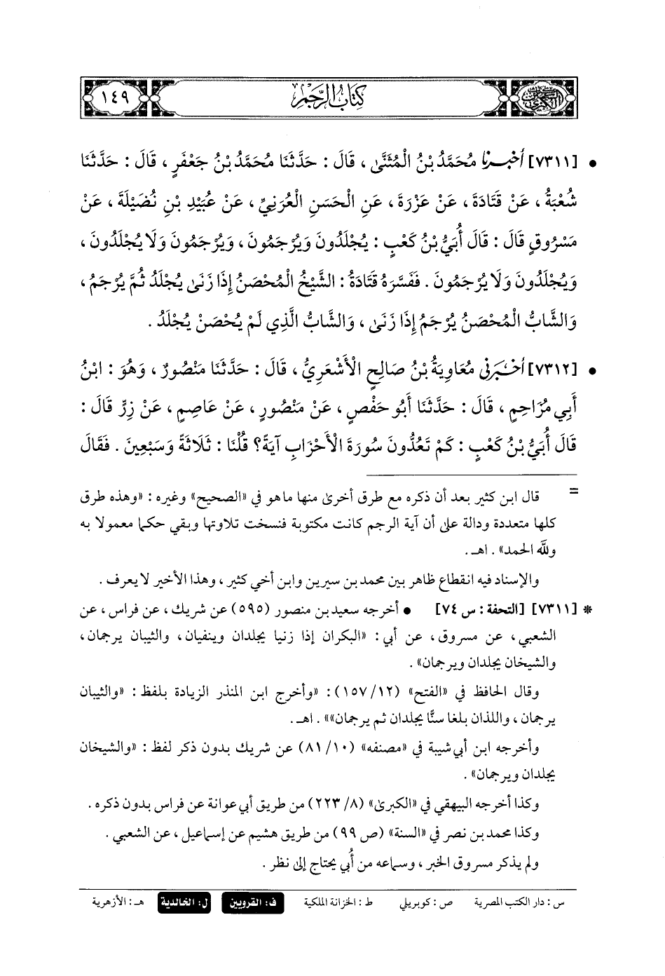 7312- أَخْبَرَنِي مُعاويَةُ بنُ صَالِحٍ الأَشْعَرِيُّ، قَالَ: حَدَّثنا مَنْصُورٌ، وَهُوَ ابْنُ أَبي مُزَاحِمٍ، قَالَ: حَدَّثنا أَبو حَفْصٍ، عَن مَنْصُورٍ، عَن عَاصِمٍ، عَن زِرٍّ، قَالَ: قَالَ أُبَيُّ بنُ كَعْبٍ: كَمْ تَعُدُّونَ سُورَةَ الأَحْزَابِ آيَةً؟ قُلْنَا: ثَلاثَةً وَسَبْعِينَ، فَقَالَ أُبَيٌّ: كَانَتْ لَتَعْدِلُ سُورَةَ البَقَرَةِ أوْ أَطْوَلَ، وَلَقَدْ كَانَ فِيهَا آيَةُ الرَّجْمِ الشَّيْخُ وَالشَّيْخَةُ فَارْجُمُوهُمَا البَتَّةَ نَكَالاً مِنَ اللهِ وَاللهُ عَزِيزٌ حَكِيمٌ.