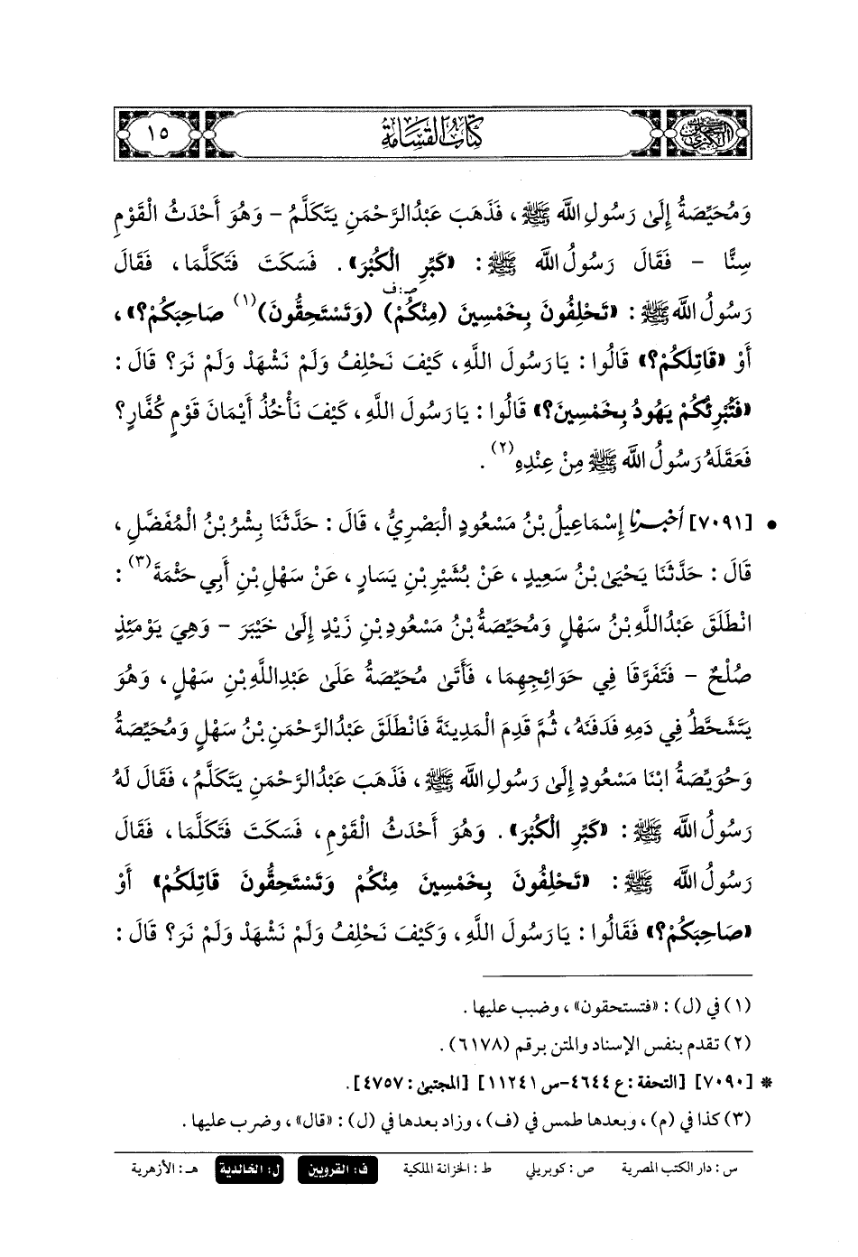 7091- أَخبَرنا إِسمَاعِيلُ بنُ مَسْعُودٍ البَصْرِيُّ، قَالَ: حَدَّثنا بِشْرُ بنُ المُفَضَّلِ، قَالَ: حَدَّثنا يَحْيَى بنُ سَعِيدٍ، عَن بُشَيْرِ بنِ يَسَارٍ، عَن سَهْلِ بنِ أَبي حَثْمَةَ، انْطَلَقَ عَبدُ اللهِ بنُ سَهْلٍ، وَمُحَيِّصَةُ بنُ مَسْعُودِ بنِ زَيْدٍ إِلَى خَيْبَرَ، وَهِيَ يَوْمَئِذٍ صُلْحٌ، فَتَفَرَّقَا فِي حَوَائِجِهِمَا، فَأَتَى مُحَيِّصَةُ عَلَى عَبدِ اللهِ بنِ سَهْلٍ، وَهُوَ يَتَشَحَّطُ فِي دَمِهِ، فَدَفَنَهُ، ثُمَّ قَدِمَ المَدِينَةَ، فَانْطَلَقَ عَبدُ الرَّحمَنِ بنُ سَهْلٍ، ومُحَيِّصَةُ، وَحُوَيِّصَةُ ابْنَا مَسْعُودٍ إِلَى رَسُولِ اللهِ صَلى الله عَلَيهِ وسَلم، فَذَهَبَ عَبدُ الرَّحمَنِ يَتَكَلَّمُ، فَقَالَ لَهُ رَسُولُ اللهِ صَلى الله عَلَيهِ وسَلم: كَبِّرِ الكُبْرَ، وَهُوَ أَحْدَثُ القَوْمِ، فَسَكَتَ، فَتَكَلَّمَا، فَقَالَ رَسُولُ اللهِ صَلى الله عَلَيهِ وسَلم: تَحْلِفُونَ بِخَمْسِينَ مِنْكُمْ، وَتَسْتَحِقُّونَ قَاتِلَكُمْ، أَوْ صَاحِبَكُمْ؟ فَقَالُوا: يَا رَسُولَ اللهِ، وَكَيْفَ نَحْلِفُ، وَلَمْ نَشْهَدْ، وَلَمْ نَرَ؟ قَالَ: تُبَرِّئُكُمْ يَهُودُ بِخَمْسِينَ؟ فَقَالُوا: يَا رَسُولَ اللهِ، كَيْفَ نَأْخُذُ أَيْمَانَ قَوْمٍ كُفَّارٍ؟ فَعَقَلَهُ رَسُولُ اللهِ صَلى الله عَلَيهِ وسَلم مِنْ عِنْدِهِ.