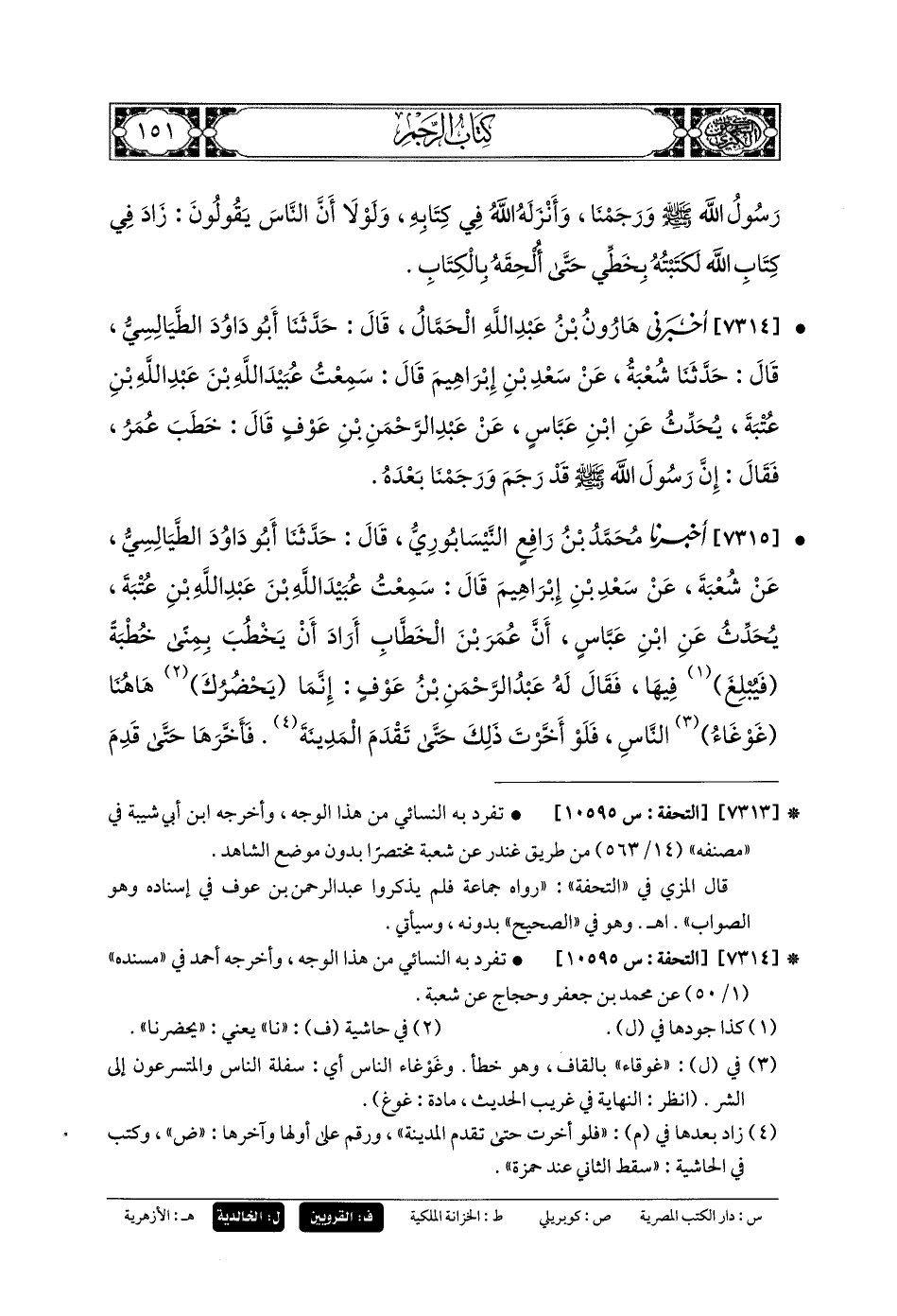 7315- أَخبَرنا مُحَمدُ بنُ رَافِعٍ النَّيْسَابُورِيُّ، قَالَ: حَدَّثنا أَبو دَاوُدَ الطَّيَالِسِيُّ، عَن شُعْبَةَ، عَن سَعْدِ بنِ إِبْرَاهِيمَ، قَالَ: سَمِعْتُ عُبَيْدَ اللهِ بْنَ عَبدِ اللهِ بنِ عُتْبَةَ يُحَدِّثُ عَنِ ابْنِ عَبَّاسٍ، أَنَّ عُمَرَ بْنَ الخَطَّابِ أَرَادَ أَنْ يَخْطُبَ بِمِنًى خُطْبَةً فَيُبْلِغَ فِيهَا، فَقَالَ لَهُ عَبدُ الرَّحمَنِ بنُ عَوْفٍ: إِنَّمَا يَحْضُرُكَ هَاهُنَا غَوْغَاءُ النَّاسِ، فَلَوْ أَخَّرْتَ ذَلِكَ حَتَّى تَقْدُمَ المَدِينَةَ، فَأَخِّرْهَا حَتَّى قَدِمَ المَدِينَةَ، قَالَ: فَدَنَوْتُ مِنَ المِنْبَرِ فَسَمِعْتُهُ يَخْطُبُ فَقَالَ فِي خُطْبَتِهِ: أَلا إِنَّ رَسُولَ اللهِ صَلى الله عَلَيهِ وسَلم رَجَمَ وَرَجَمْنَا بَعْدَهُ.