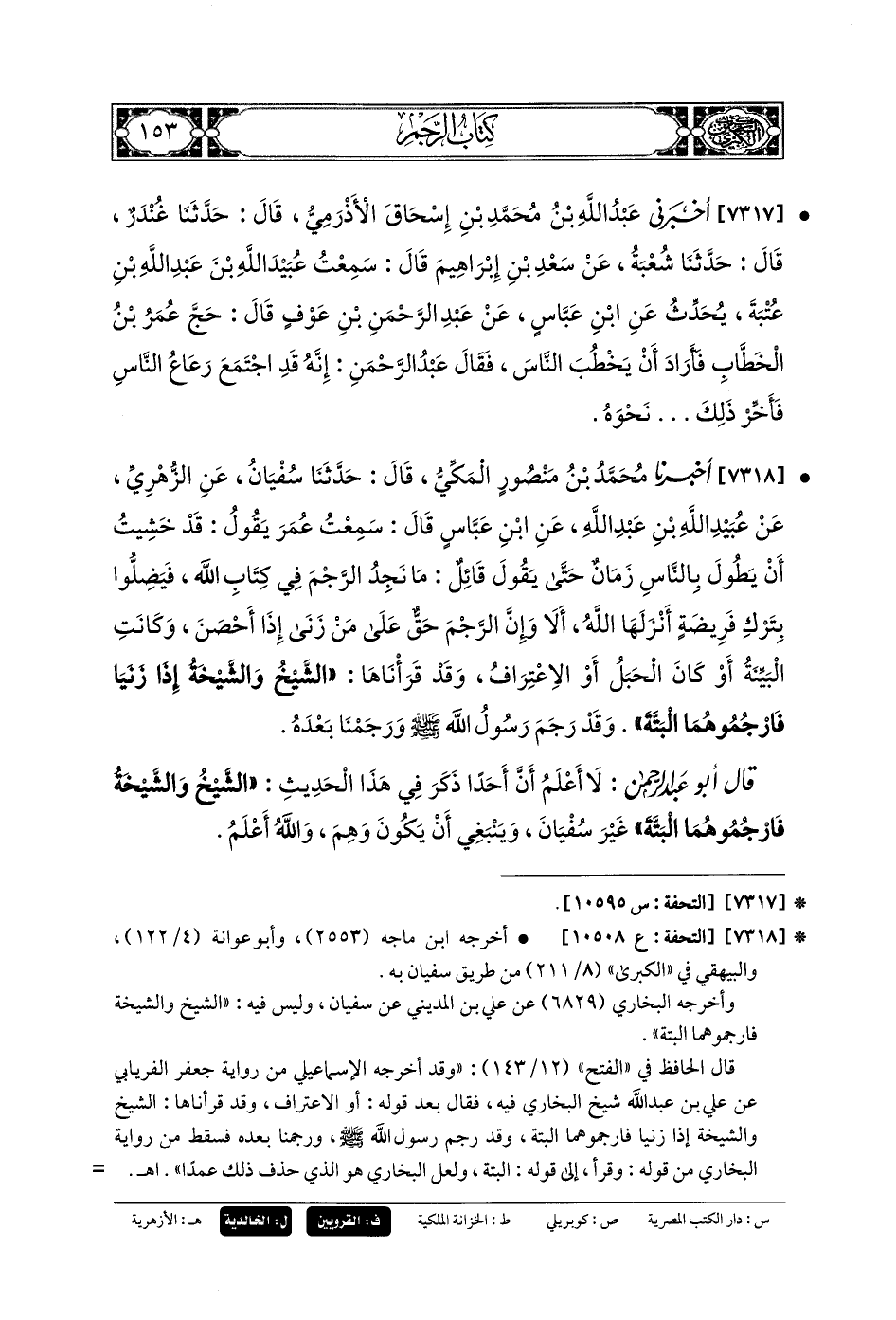 7318 - أَخبَرنا مُحَمدُ بنُ مَنْصُورٍ المَكِّيُّ، قَالَ: حَدَّثنا سُفيانُ، عَنِ الزُّهْرِيِّ، عَن عُبَيْدِ اللهِ بنِ عَبدِ اللهِ، عَنِ ابْنِ عَبَّاسٍ، قَالَ: سَمِعْتُ عُمَرَ يَقُولُ: قَدْ خَشِيتُ أَنْ يَطُولَ بِالنَّاسِ زَمَانٌ حَتَّى يَقُولَ قَائِلٌ: مَا نَجِدُ الرَّجْمَ فِي كِتَابِ اللهِ، فَيَضِلُّوا بِتَرْكِ فَرِيضَةٍ أَنْزَلَهَا اللهُ، أَلا وَإِنَّ الرَّجْمَ حَقٌّ عَلَى مَنْ زَنَا إِذَا أَحْصَنَ وَكَانَتِ البَيِّنَةُ أَوْ كَانَ الحَبَلُ أَوْ الاِعْتِرَافُ، وَقَدْ قَرَأْنَاهَا: الشَّيْخُ وَالشَّيْخَةُ إِذَا زَنَيَا فَارْجُمُوهُمَا البَتَّةَ، وَقَدْ رَجَمَ رَسُولُ اللهِ صَلى الله عَلَيهِ وسَلم، وَرَجَمْنَا بَعْدَهُ.