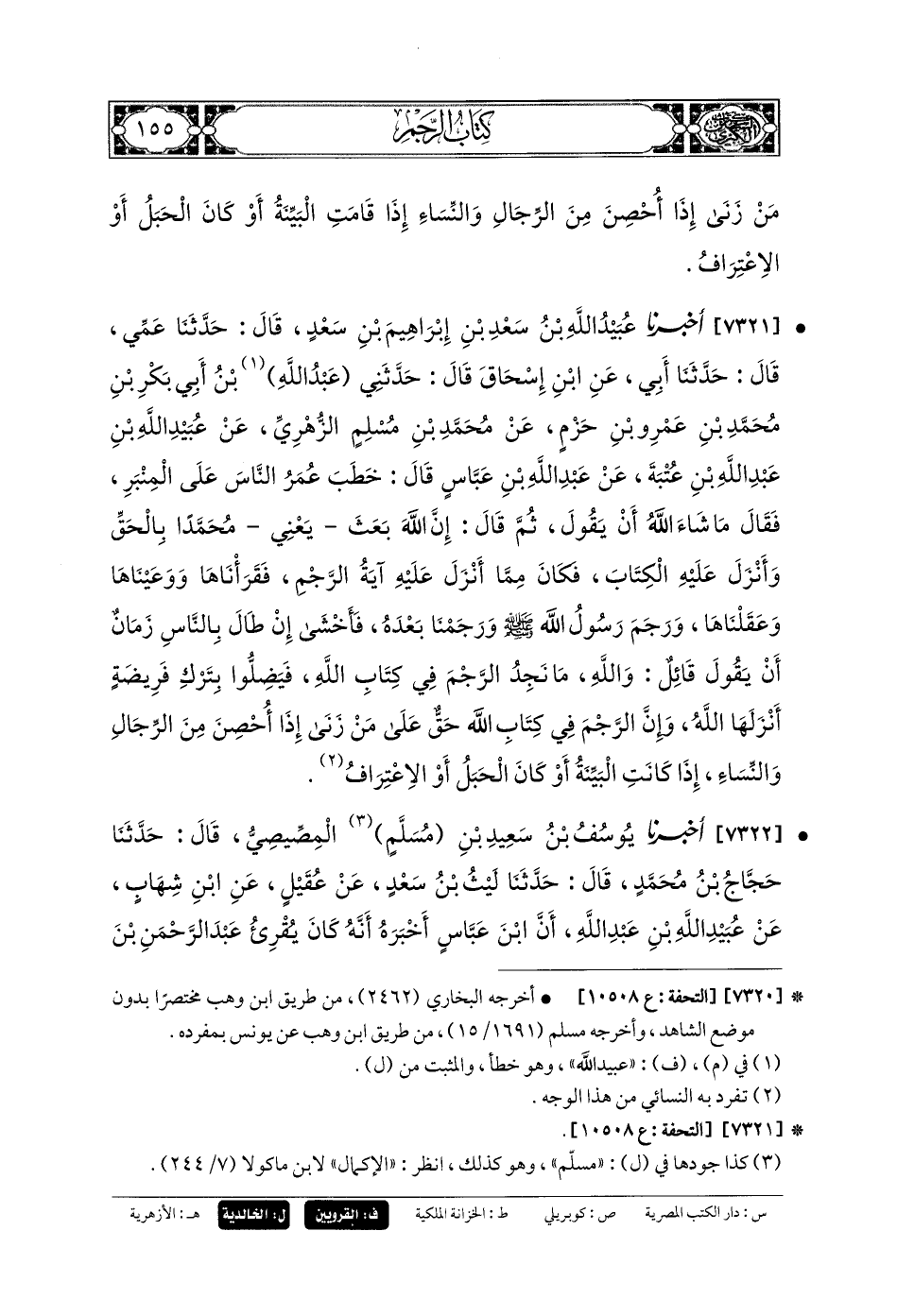 7321 - أَخبَرنا عُبَيْدُ اللهِ بنُ سَعْدِ بنِ إِبْرَاهِيمَ بنِ سَعْدٍ، قَالَ: حَدَّثنا عَمِّي، قَالَ: حَدَّثنا أَبي، عَنِ ابْنِ إِسحَاقَ، قَالَ: حَدَّثني عَبدُ اللهِ بنُ أَبي بَكْرِ بنِ مُحَمدِ بنِ عَمْرِو بنِ حَزْمٍ، عَن مُحَمدِ بنِ مُسْلِمٍ الزُّهْرِيِّ، عَن عُبَيْدِ اللهِ بنِ عَبدِ اللهِ بنِ عُتْبَةَ، عَن عَبدِ اللهِ بنِ عَبَّاسٍ، قَالَ: خَطَبَ عُمَرُ النَّاسَ عَلَى المِنْبَرِ، فَقَالَ مَا شَاءَ اللهُ أَنْ يَقُولَ، ثُمَّ قَالَ: إِنَّ اللهَ بَعَثَ، يَعْنِي مُحَمدًا صَلى الله عَلَيهِ وسَلم بِالحَقِّ، وَأَنْزَلَ عَلَيْهِ الكِتَابَ، فَكَانَ مِمَّا أَنْزَلَ عَلَيْهِ آيَةُ الرَّجْمِ، فَقَرَأْنَاهَا وَوَعَيْنَاهَا وَعَقَلْنَاهَا، وَرَجَمَ رَسُولُ اللهِ صَلى الله عَلَيهِ وسَلم وَرَجَمْنَا بَعْدَهُ، فَأَخْشَى إِنْ طَالَ بِالنَّاسِ زَمَانٌ أَنْ يَقُولَ قَائِلٌ: وَاللهِ مَا نَجِدُ الرَّجْمَ فِي كِتَابِ اللهِ فَيَضِلُّوا بِتَرْكِ فَرِيضَةٍ أَنْزَلَهَا اللهُ، وَإِنَّ الرَّجْمَ فِي كِتَابِ اللهِ حَقٌّ عَلَى مَنْ زَنَا إِذَا أُحْصِنَ مِنَ الرِّجَالِ وَالنِّسَاءِ، إِذَا كَانَتِ البَيِّنَةُ أَوْ كَانَ الحَبَلُ أَوْ الاِعْتِرَافُ.