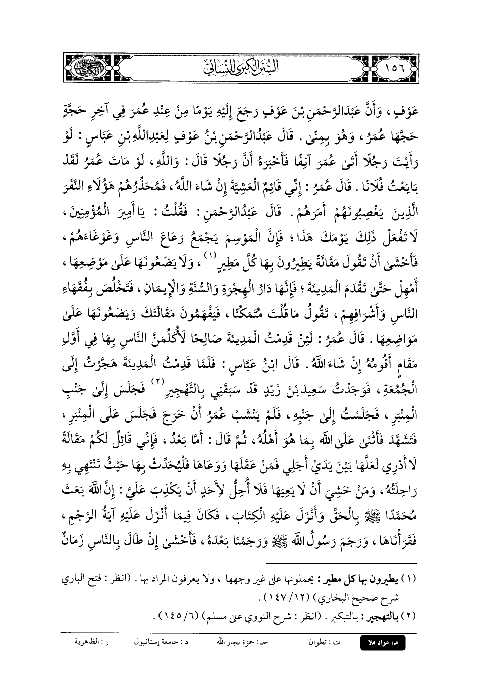قَالَ عُمَرُ: لَئِنْ قَدِمَتُ المَدِينَةَ صَالِحًا لأُكَلِّمَنَّ النَّاسَ بِهَا فِي أَوَّلِ مَقَامٍ أَقُومُهُ إِنْ شَاءَ اللهُ، قَالَ ابْنُ عَبَّاسٍ: فَلَمَّا قَدِمَتُ المَدِينَةَ هَجَّرْتُ إِلَى الجُمُعَةِ، فَوَجَدْتُ سَعِيدَ بْنَ زَيْدٍ قَدْ سَبَقَنِي بِالتَّهْجِيرِ، فَجَلَسَ إِلَى جَنْبِ المِنْبَرِ، فَجَلَسْتُ إِلَى جَنْبِهِ، فَلَمْ يَنْشَبْ عُمَرُ أَنْ خَرَجَ فَجَلَسَ عَلَى المِنْبَرِ، فَتَشَهَّدَ فَأَثْنَى عَلَى اللهِ بِمَا هُوَ أَهْلُهُ، ثُمَّ قَالَ: أَمَّا بَعْدُ، فَإِنِّي قَائِلٌ لَكُمْ مَقَالَةً لا أَدْرِي لَعَلَّهَا بَيْنَ يَدَيْ أَجَلِي، فَمَنْ عَقَلَهَا وَوَعَاهَا فَلْيُحَدِّثْ بِهَا حَيْثُ تَنْتَهِي بِهِ رَاحِلَتُهُ، وَمَنْ خَشِيَ أَنْ لا يَعِيَهَا فَلا أُحِلُّ لأَحَدٍ أَنْ يَكْذِبَ عَلَيَّ، إِنَّ اللهَ بَعَثَ مُحَمدًا صَلى الله عَلَيهِ وسَلم بِالحَقِّ، وَأَنْزَلَ عَلَيْهِ الكِتَابَ، فَكَانَ فِيمَا أَنْزَلَ عَلَيْهِ آيَةُ الرَّجْمِ فَقَرَأْنَاهَا، وَرَجَمَ رَسُولُ اللهِ صَلى الله عَلَيهِ وسَلم وَرَجَمْنَا بَعْدَهُ، فَأَخْشَى إِنْ طَالَ بِالنَّاسِ زَمَانٌ أَنْ يَقُولَ قَائِلٌ: مَا نَجِدُ الرَّجْمَ فِي كِتَابِ اللهِ، فَيَضِلُّونَ بِتَرْكِ فَرِيضَةٍ أَنْزَلَهَا اللهُ، وَإِنَّ الرَّجْمَ فِي كِتَابِ اللهِ حَقٌّ عَلَى مَنْ زَنَا إِذَا أُحْصِنَ مِنَ الرِّجَالِ وَالنِّسَاءِ، إِذَا قَامَتِ البَيِّنَةُ أَوْ كَانَ الحَبَلُ أَوْ الاِعْتِرَافُ.