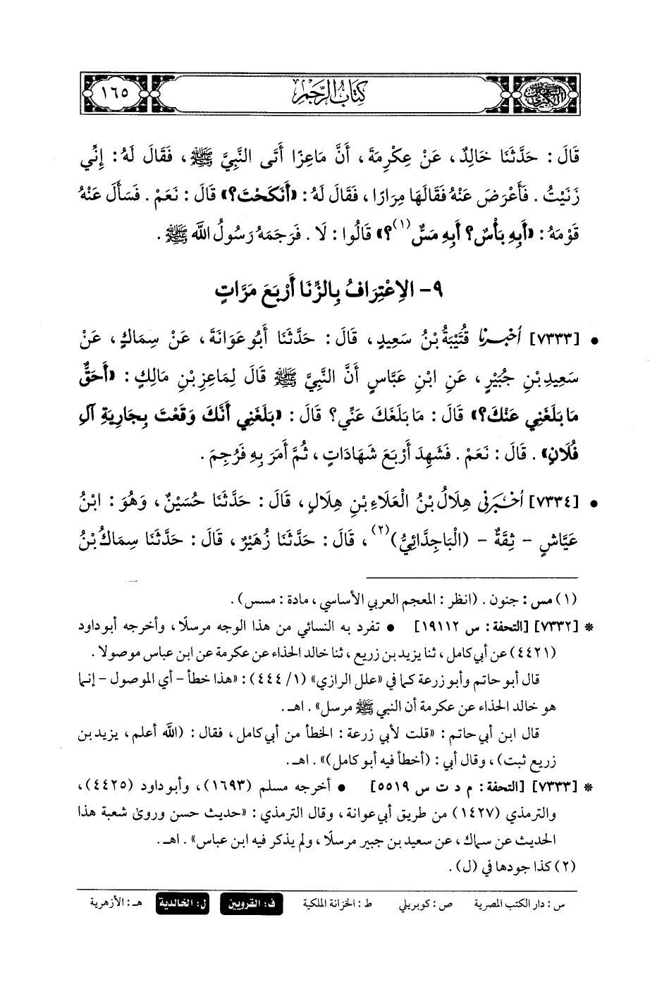 7334- أَخْبَرَنِي هِلالُ بنُ العَلاءِ بنِ هِلالٍ، قَالَ: حَدَّثنا حُسَيْنٌ، وَهُوَ ابْنُ عَيَّاشٍ، ثِقَةٌ البَاجِدَّائِيُّ، قَالَ: حَدَّثنا زُهَيْرٌ، قَالَ: حَدَّثنا سِمَاكُ بنُ حَرْبٍ، قَالَ: حَدَّثني سَعِيدُ بنُ جُبَيْرٍ، عَنِ ابْنِ عَبَّاسٍ، قَالَ: قَالَ رَسُولُ اللهِ صَلى الله عَلَيهِ وسَلم: حَقٌّ مَا بَلَغَنِي عَنكَ يا مَاعِزُ أَنَّكَ وَقَعْتَ عَلَى وَلِيدَةِ بَنِي فُلانٍ؟ قَالَ: نَعَمْ، فَاعْتَرَفَ أَرْبَعَ مَرَّاتٍ، مَرَّتَيْنِ مَرَّتَيْنِ، فَرَجَمَهُ.