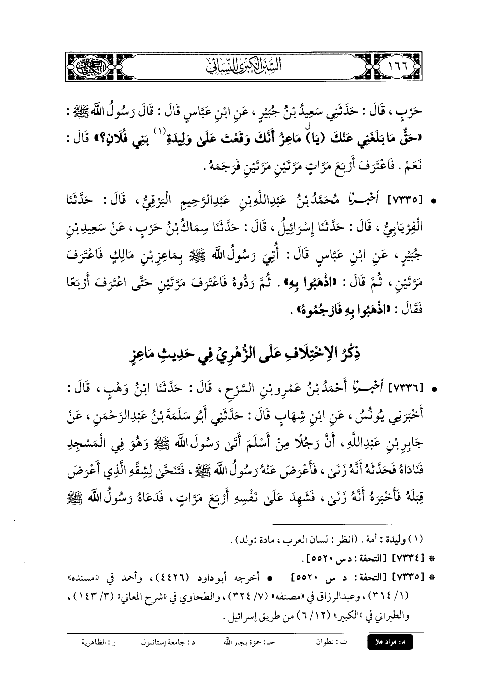 7335- أَخبَرنا مُحَمدُ بنُ عَبدِ اللهِ بنِ عَبدِ الرَّحِيمِ البَرْقِيُّ، قَالَ: حَدَّثنا الفِرْيَابِيُّ، قَالَ: حَدَّثنا إِسرَائِيلُ، قَالَ: حَدَّثنا سِمَاكُ بنُ حَرْبٍ، عَن سَعِيدِ بنِ جُبَيْرٍ، عَنِ ابْنِ عَبَّاسٍ، قَالَ: أُتِيَ رَسُولُ اللهِ صَلى الله عَلَيهِ وسَلم بِمَاعِزِ بنِ مَالِكٍ، فَاعْتَرَفَ مَرَّتَيْنِ، ثُمَّ قَالَ: اذْهَبُوا بِهِ، ثُمَّ رُدُّوهُ، فَاعْتَرَفَ مَرَّتَيْنِ، حَتَّى اعْتَرَفَ أَرْبَعًا، فَقَالَ: اذْهَبُوا بِهِ فَارْجُمُوهُ.