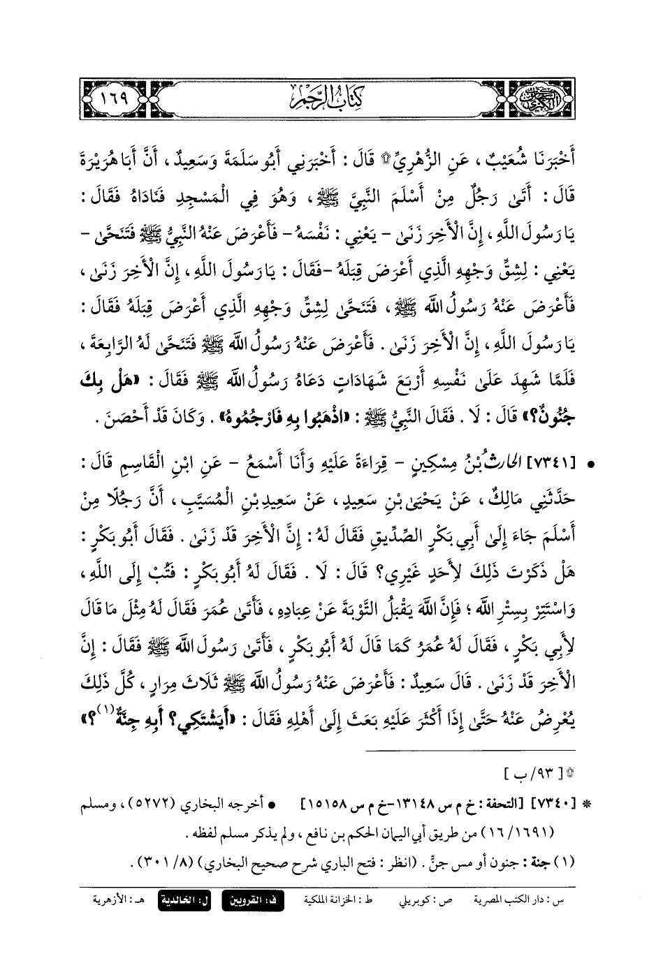 7341- الحَارِثُ بنُ مِسْكِينٍ، قِرَاءَةً عَلَيْهِ، وَأنا أَسْمَعُ، عَنِ ابْنِ القَاسِمِ، قَالَ: حَدَّثني مَالِكٌ، عَن يَحْيَى بنِ سَعِيدٍ، عَن سَعِيدِ بنِ المُسَيَّبِ، أَنَّ رَجُلاً مِنْ أَسْلَمَ جَاءَ إِلَى أَبي بَكْرٍ الصِّدِّيقِ، فَقَالَ لَهُ: إِنَّ الآخِرَ قَدْ زِنَى، فَقَالَ أَبو بَكْرٍ: هَلْ ذَكَرْتَ ذَلِكَ لأَحَدٍ غَيْرِي؟ قَالَ: لا، فَقَالَ لَهُ أَبو بَكْرٍ: فَتُبْ إِلَى اللهِ، وَاسْتَتِرْ بِسِتْرِ اللهِ، فَإِنَّ اللهَ يَقْبَلُ التَّوْبَةَ عَن عِبَادِهِ، فَأَتَى عُمَرَ، فَقَالَ لَهُ مِثْلَ مَا قَالَ لأَبي بَكْرٍ، فَقَالَ لَهُ عُمَرُ كَمَا قَالَ لَهُ أَبو بَكْرٍ، فَأَتَى رَسُولَ اللهِ صَلى الله عَلَيهِ وسَلم فَقَالَ: إِنَّ الآخِرَ قَدْ زِنَى، قَالَ سَعِيدٌ: فَأَعْرَضَ عَنهُ رَسُولُ اللهِ صَلى الله عَلَيهِ وسَلم، ثَلاثَ مِرَارٍ، كُلُّ ذَلِكَ يُعْرِضُ عَنهُ، حَتَّى إِذَا أَكْثَرَ عَلَيْهِ بَعَثَ إِلَى أَهْلِهِ، فَقَالَ: أَيَشْتَكِي؟ أَبِهِ جِنَّةٌ؟ فقَالُوا: وَاللهِ إِنَّهُ لَصَحِيحٌ، فَقَالَ رَسُولُ اللهِ صَلى الله عَلَيهِ وسَلم: أَبِكْرٌ، أَمْ ثَيِّبٌ؟ قَالَ: بَلْ ثَيِّبٌ، فَأَمَرَ بِهِ رَسُولُ اللهِ صَلى الله عَلَيهِ وسَلم، فَرُجِمَ.