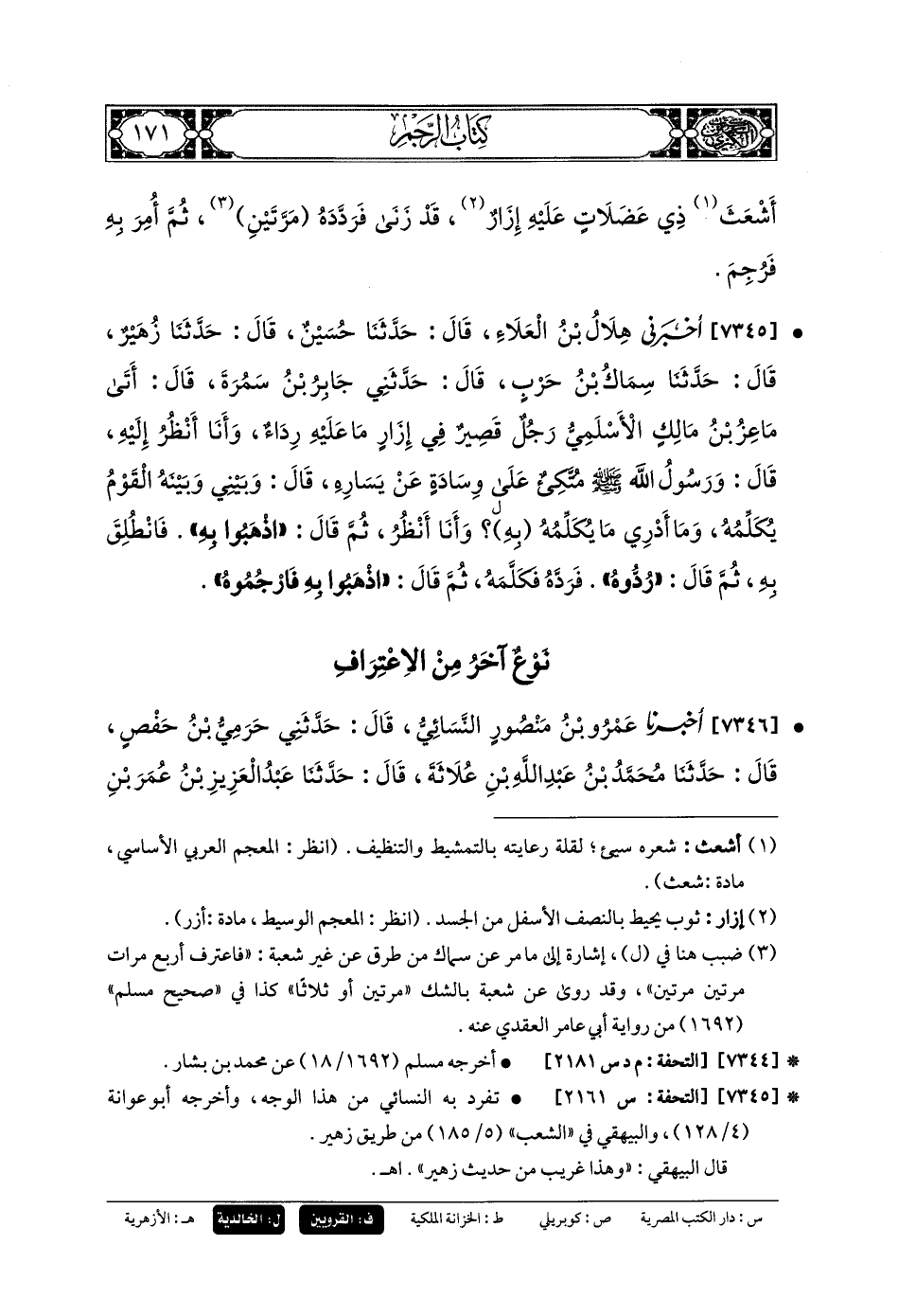 7345- أَخْبَرَنِي هِلالُ بنُ العَلاءِ، قَالَ: حَدَّثنا حُسَيْنٌ، قَالَ: حَدَّثنا زُهَيْرٌ، قَالَ: حَدَّثنا سِمَاكُ بنُ حَرْبٍ، قَالَ: حَدَّثني جَابِرُ بنُ سَمُرَةَ، قَالَ: أَتَى مَاعِزُ بنُ مَالِكٍ الأَسْلَمِيُّ رَجُلٌ قَصِيرٌ فِي إِزَارٍ مَا عَلَيْهِ رِدَاءٌ وَأَنَا أَنْظُرِ إِلَيْهِ، قَالَ: وَرَسُولُ اللهِ صَلى الله عَلَيهِ وسَلم مُتَّكِئٌ عَلَى وِسَادَةِ عَن يَسَارِهِ، قَالَ: وَبَيْنِي وَبَيْنَهُ القَوْمُ، يُكَلِّمُهُ وَمَا أَدْرِي مَا يُكَلِّمُهُ بِهِ، وَأَنَا أَنْظُرُ، ثُمَّ قَالَ: اذْهَبُوا بِهِ، فَانْطُلِقَ بِهِ، ثُمَّ قَالَ: رُدُّوهُ، فَرَدَّه فَكَلَّمَهُ، ثُمَّ قَالَ: اذْهَبُوا بِهِ، فَارْجُمُوهُ.