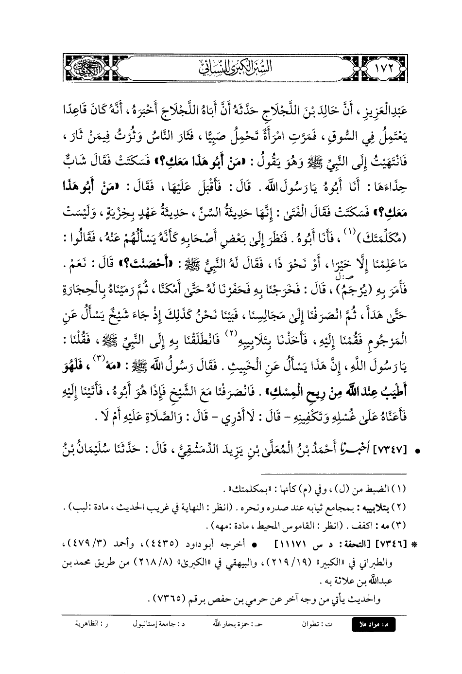 7347- أَخبَرنا أَحْمَدُ بنُ المُعَلَّى بنِ يَزِيدَ الدِّمَشْقِيُّ، قَالَ: حَدَّثنا سُلَيْمَانُ بنُ عَبدِ الرَّحمَنِ، وَعَبدُ الرَّحمَنِ بنُ إِبْرَاهِيمَ، قَالا: حَدَّثنا الوَلِيدُ، هُوَ ابْنُ مُسْلِمٍ، قَالَ: حَدَّثنا مُحَمدُ بنُ عَبدِ اللهِ الشُّعَيْثِيُّ، عَن مَسْلَمَةَ بنِ عَبدِ اللهِ الجُهَنِيِّ، عَن خَالِدِ بنِ اللَّجَّلاجِ، عَن أَبيهِ، قَالَ: كُنَّا نَعْمَلَ فِي السُّوقِ، فَأَمَرَ رَسُولُ اللهِ صَلى الله عَلَيهِ وسَلم بِرَجُلٍ فَرُجِمَ، فَجَاءَ رَجُلٌ فَسَأَلَنَا أَنْ نَدُلَّهُ عَلَى مَكَانِهِ الَّذِي رُجِمَ فِيهِ؟ فَتَعَلَّقْنَا بِهِ، حَتَّى أَتَيْنَا بِهِ رَسُولَ اللهِ صَلى الله عَلَيهِ وسَلم فَقُلْنَا: يَا رَسُولَ اللهِ، إِنَّ هَذَا جَاءَ لِيَسْأَلَنَا عَن ذَلِكَ الخَبِيثِ الَّذِي رَجَمْتَ اليَوْمَ، فَقَالُ رَسُولُ اللهِ صَلى الله عَلَيهِ وسَلم: لا تَقُولُوا خَبِيثٌ، فَوَاللَّهِ لَهُوَ أَطْيَبُ عِنْدَ اللهِ مِنَ المِسْكِ.