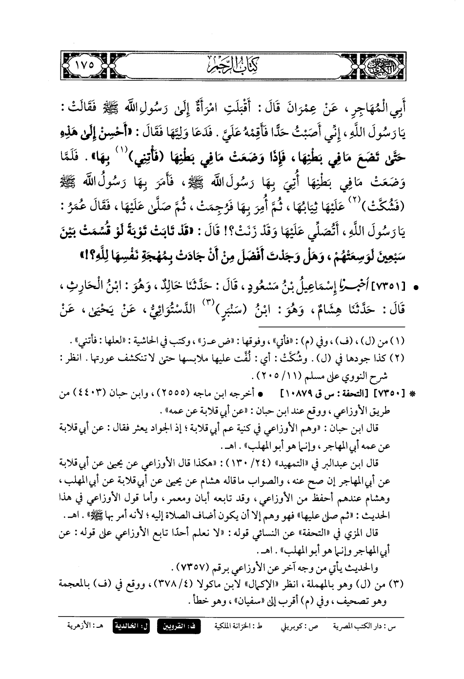7351- أَخبَرنا إِسمَاعِيلُ بنُ مَسْعُودٍ، قَالَ: حَدَّثنا خَالِدٍ، وَهُوَ ابْنُ الحَارِثِ، قَالَ: حَدَّثنا هِشَامٌ، وهُوَ ابْنُ سَنْبَرَ الدَّسْتُوَائِيُّ، عَن يَحْيَى، عَن أَبي قِلابَةَ، عَن أَبي المُهَلَّبِ، عَن عِمْرَانَ بنِ حُصَيْنٍ، أَنَّ امْرَأَةً مِنْ جُهَيْنَةَ أَتَتْ رَسُولَ اللهِ صَلى الله عَلَيهِ وسَلم فَقَالَتْ: إِنِّي زَنَيْتُ وَهِيَ حُبْلَى، فَدَفَعَهَا إِلَى وَلِيِّهَا فَقَالَ: أَحْسِنْ إِلَيْهَا، فَإِذَا وَضَعَتْ فَائْتِنِي بِهَا، فَلَمَّا وَضَعَتْ جَاءَ بِهَا فَأَمَرَ بِهَا فَشُكَّتْ عَلَيْهَا ثِيَابُهَا، ثُمَّ رَجَمَهَا، ثُمَّ صَلَّى عَلَيْهَا، فَقَالَ لَهُ عُمَرُ: تُصَلِّي عَلَيْهَا وَقَدْ زَنَتْ؟ فَقَالَ: لَقَدْ تَابَتْ تَوْبَةً لَوْ قُسِّمَتْ بَيْنَ سَبْعِينَ مِنْ أَهْلِ المَدِينَةِ لَوَسِعَتْهُمْ، أَفْضَلُ مِنْ أَنْ جَادَتْ بِنَفْسِهَا للهِ؟.