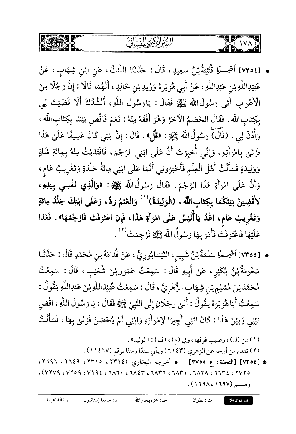 7354 - أَخبَرنا قُتَيبَةُ بنُ سَعِيدٍ، قَالَ: حَدَّثنا اللَّيْثُ، عَنِ ابْنِ شِهَابٍ، عَن عُبَيْدِ اللهِ بنِ عَبدِ اللهِ، عَن أَبي هُرَيْرَةَ، وَزَيْدِ بنِ خَالِدٍ، أَنَّهُمَا قَالا: إِنَّ رَجُلاً مِنَ الأَعْرَابِ أَتَى رَسُولَ اللهِ صَلى الله عَلَيهِ وسَلم، فَقَالَ: يَا رَسُولَ اللهِ، أَنْشُدُكَ ألا قَضَيْتَ لِي بِكِتَابِ اللهِ، فَقَالَ الخَصْمُ الآخَرُ، وَهُوَ أَفْقَهُ مِنْهُ: نَعَمْ فَاقْضِ بَيْنَنَا بِكِتَابِ اللهِ، وَائْذَنْ لِي، قَالَ رَسُولُ اللهِ صَلى الله عَلَيهِ وسَلم: قُلْ: قَالَ: إِنَّ ابْنِي كَانَ عَسِيفًا عَلَى هَذَا، فَزَنَى بِامْرَأَتِهِ، وَإِنِّي أُخْبِرْتُ أَنَّ عَلَى ابْنِي الرَّجْمَ، فَافْتَدَيْتُ مِنْهُ بِمِئَةِ شَاةٍ وَوَلِيدَةٍ، فَسَأَلْتُ أَهْلَ العِلْمِ فَأَخْبَرُونِي أَنَّ مَا عَلَى ابْنِي مِئَةُ جَلْدَةٍ وَتَغْرِيبُ عَامٍ، وَأَنْ عَلَى امْرَأَةِ هَذَا الرَّجْمَ، فَقَالَ رَسُولُ اللهِ صَلى الله عَلَيهِ وسَلم: وَالَّذِي نَفْسِي بِيَدِهِ، لأَقْضِيَنَّ بَيْنَكُمَا بِكِتَابِ اللهِ، الوَلِيدَةُ وَالغَنَمُ رَدٌّ، وَعَلَى ابْنِكِ جَلْدُ مِئَةٍ وَتَغْرِيبُ عَامٍ، اغْدُ يَا أُنَيْسُ عَلَى امْرَأَةِ هَذَا، فَإِنِ اعْتَرَفَتْ، فَارْجُمْهَا، فَغَدَا عَلَيْهَا، فَاعْتَرَفَتْ فَأَمَرَ بِهَا رَسُولُ اللهِ صَلى الله عَلَيهِ وسَلم فَرُجِمَتْ.