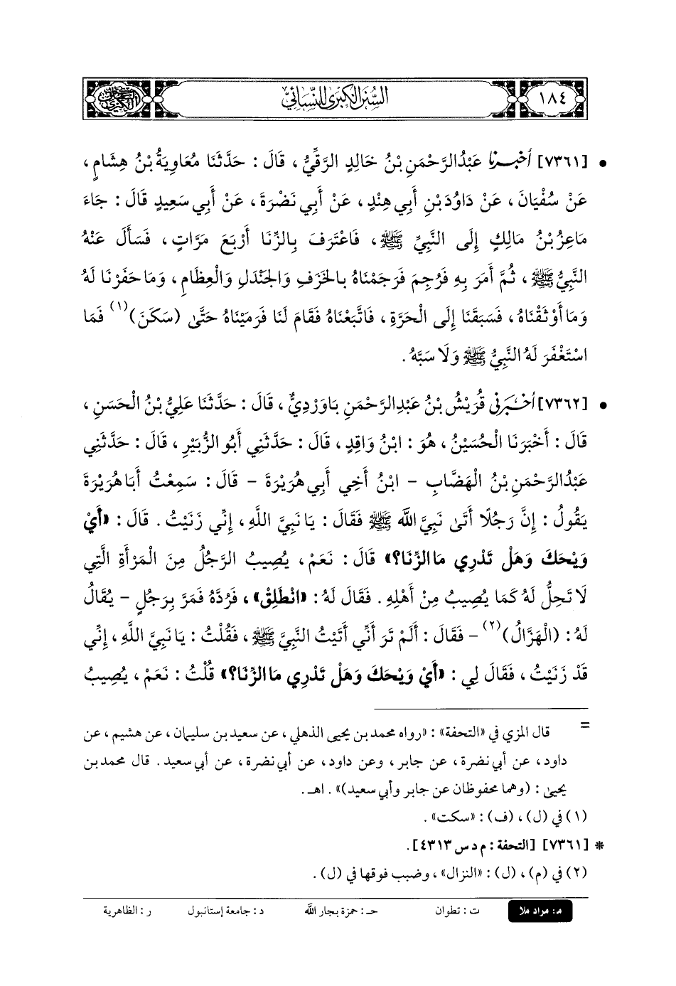 7362- أَخْبَرَنِي قُرَيْشُ بنُ عَبدِ الرَّحمَنِ، بَاوَرْدِيٌّ، قَالَ: حَدَّثنا عَليِّ بنِ الحَسَنِ، قَالَ: أَخبَرنا الحُسَيْنُ، هُوَ ابْنُ وَاقِدٍ، قَالَ: حَدَّثني أَبو الزُّبَيْرِ، قَالَ: حَدَّثني عَبدُ الرَّحمَنِ بْنَ الهَضَّابِ ابْنُ أَخِي أَبي هُرَيْرَةَ، قَالَ: سَمِعْتُ أَبَا هُرَيْرَةَ يَقُولُ: إِنَّ رَجُلاً أَتَى نَبِيَّ اللهِ صَلى الله عَلَيهِ وسَلم فَقَالَ: يَا نَبِيَّ اللهِ إِنِّي زَنَيْتُ، قَالَ: أَيْ وَيْحَكَ وَهَلْ تَدْرِي مَا الزِّنَا؟ قَالَ: نَعَمْ يُصِيبُ الرَّجُلُ مِنَ المَرْأَةِ الَّتِي لا تَحِلُّ لَهُ كَمَا يُصِيبُ مِنْ أَهْلِهِ، فَقَالَ لَهُ: انْطَلِقْ، فَرَدَّهُ، فَمَرَّ بِرَجُلٍ يُقَالُ لَهُ: الهََزَّالُ, فَقَالَ: أَلَمْ تَرَ أَنِّي أَتَيْتُ النَّبيَّ صَلى الله عَلَيهِ وسَلم فَقُلْتُ: يَا نَبِيَّ اللهِ، إِنِّي قَدْ زَنَيْتَ، فَقَالَ لِي: أَيْ وَيْحَكَ وَهَلْ تَدْرِي مَا الزِّنَا؟ قُلْتُ: نَعَمْ، يُصِيبُ الرَّجُلُ مِنَ المَرْأَةِ الَّتِي لا تَحِلُّ لَهُ كَمَا يُصِيبُ مِنْ أَهْلِهِ، وَإِنَّهُ رَدَّنِي؟ فَقَالَ لَهُ: عُدْ إِلَيْهِ، فَأَتَاهُ، فَقَالَ لَهُ: يَا نَبِيَّ اللهِ، إِنِّي زَنَيْتُ، قَالَ: أَيْ وَيْحَكَ وَهَلْ تَدْرِي مَا الزِّنَا؟ قَالَ: نَعَمْ، يُصِيبُ الرَّجُلُ مِنَ المَرْأَةِ الَّتِي لا تَحِلُّ لَهُ كَمَا يُصِيبُ مِنْ أَهْلِهِ، فَقَالَ لَهُ: انْطَلِقْ، فَرَدَّهُ، فَأَتَى الهََزَّالَ، فَقَالَ لَهُ: عُدْ إِلَيْهِ،
