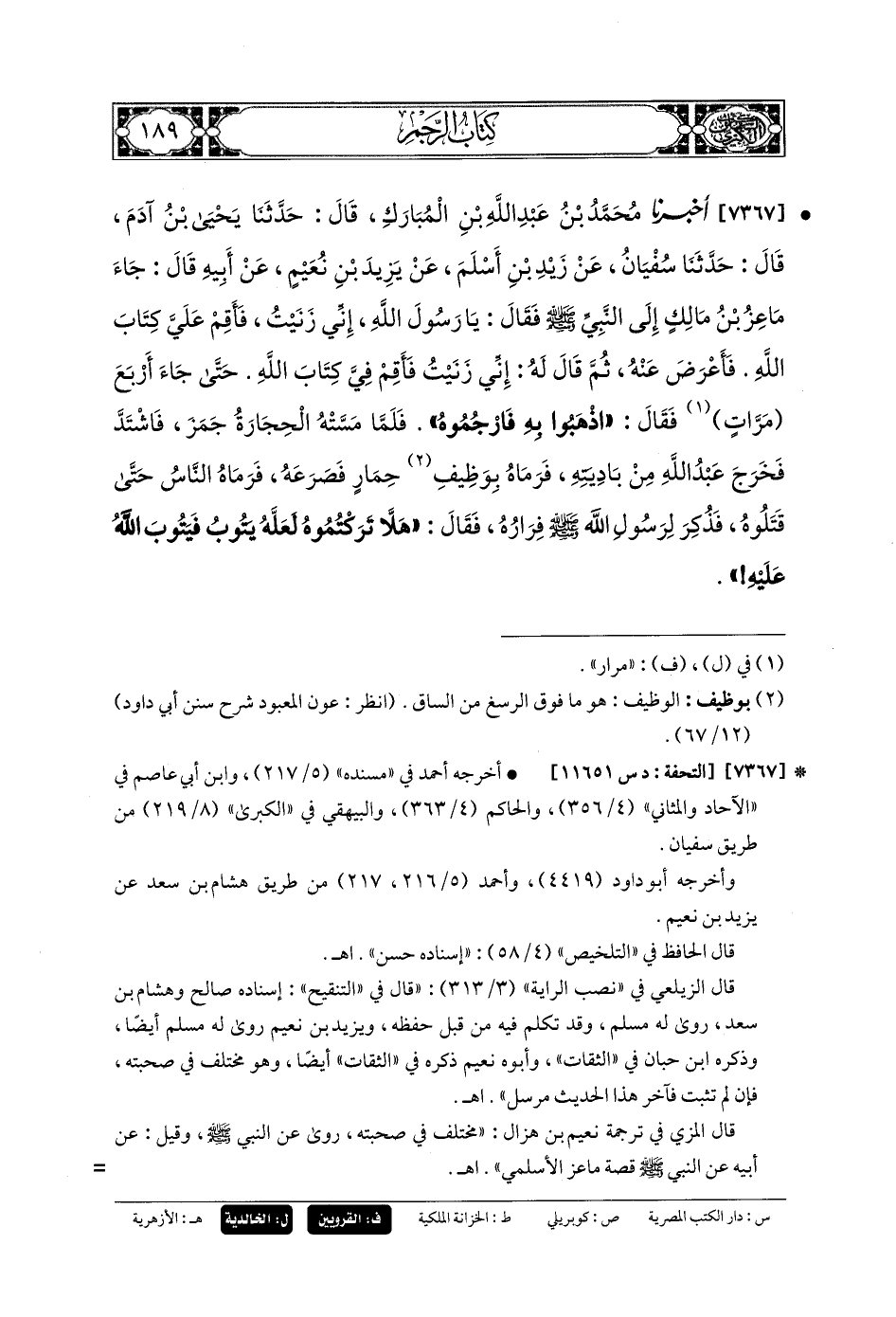 7367 - أَخبَرنا مُحَمدُ بنُ عَبدِ اللهِ بنِ المُبَارَكِ، قَالَ: حَدَّثنا يَحْيَى بنُ آدَمَ، قَالَ: حَدَّثنا سُفيانُ، عَن زَيْدِ بنِ أَسْلَمَ، عَن يَزِيدَ بنِ نُعَيْمٍ، عَن أَبيهِ، قَالَ: جَاءَ مَاعِزُ بنُ مَالِكٍ إِلَى النَّبيِّ صَلى الله عَلَيهِ وسَلم فَقَالَ: يَا رَسُولَ اللهِ، إِنِّي زَنَيْتُ، فَأَقِمْ عَلَيَّ كِتَابَ اللهِ، فَأَعْرَضَ عَنهُ، ثُمَّ قَالَ لَهُ: إِنِّي زَنَيْتُ، فَأَقِمْ فِيَّ كِتَابَ اللهِ، حَتَّى جَاءَ أَرْبَعَ مَرَّاتٍ، فَقَالَ: اذْهَبُوا بِهِ فَارْجُمُوهُ، فَلَمَّا مَسَّتْهُ الحِجَارَةُ جَمَزَ فَاشْتَدَّ، فَخَرَجَ عَبدُ اللهِ مِنْ بَادِيَتِهِ فَرَمَاهُ بِوَظِيفِ حِمَارٍ فَصَرَعَهُ، فَرَمَاهُ النَّاسُ حَتَّى قَتَلُوهُ، فَذُكِرَ لِرَسُولِ اللهِ صَلى الله عَلَيهِ وسَلم فِرَارُهُ، فَقَالَ: هَلاَّ تَرَكْتُمُوهُ، لَعَلَّهُ يَتُوبُ فَيَتُوبَ اللهُ عَلَيْهِ؟.
