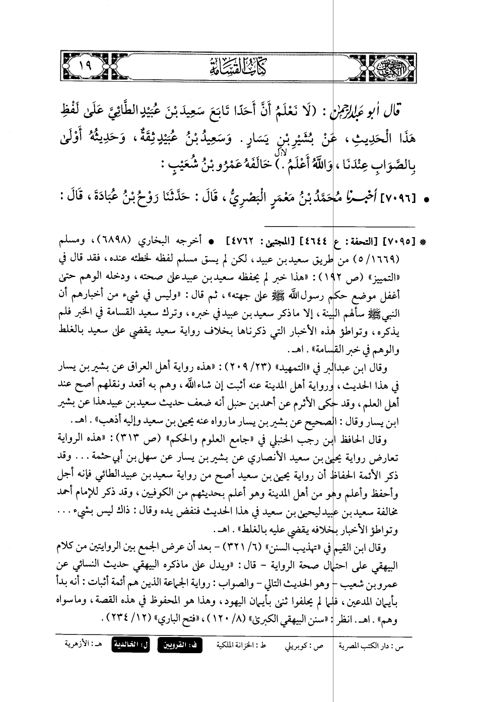قَالَ أَبو عَبدِ الرَّحمَنِ: لا نَعْلَمُ أَنَّ أَحَدًا تَابَعَ عَمْرَو بْنَ شُعَيْبٍ عَلَى هَذِهِ الرِّوَايَةِ، وَلا سَعِيدَ بْنَ عُبَيْدٍ عَلَى رِوَايَتِهِ، عَن بُشَيْرِ بنِ يَسَارٍ، وَاللهُ أَعْلَمُ.