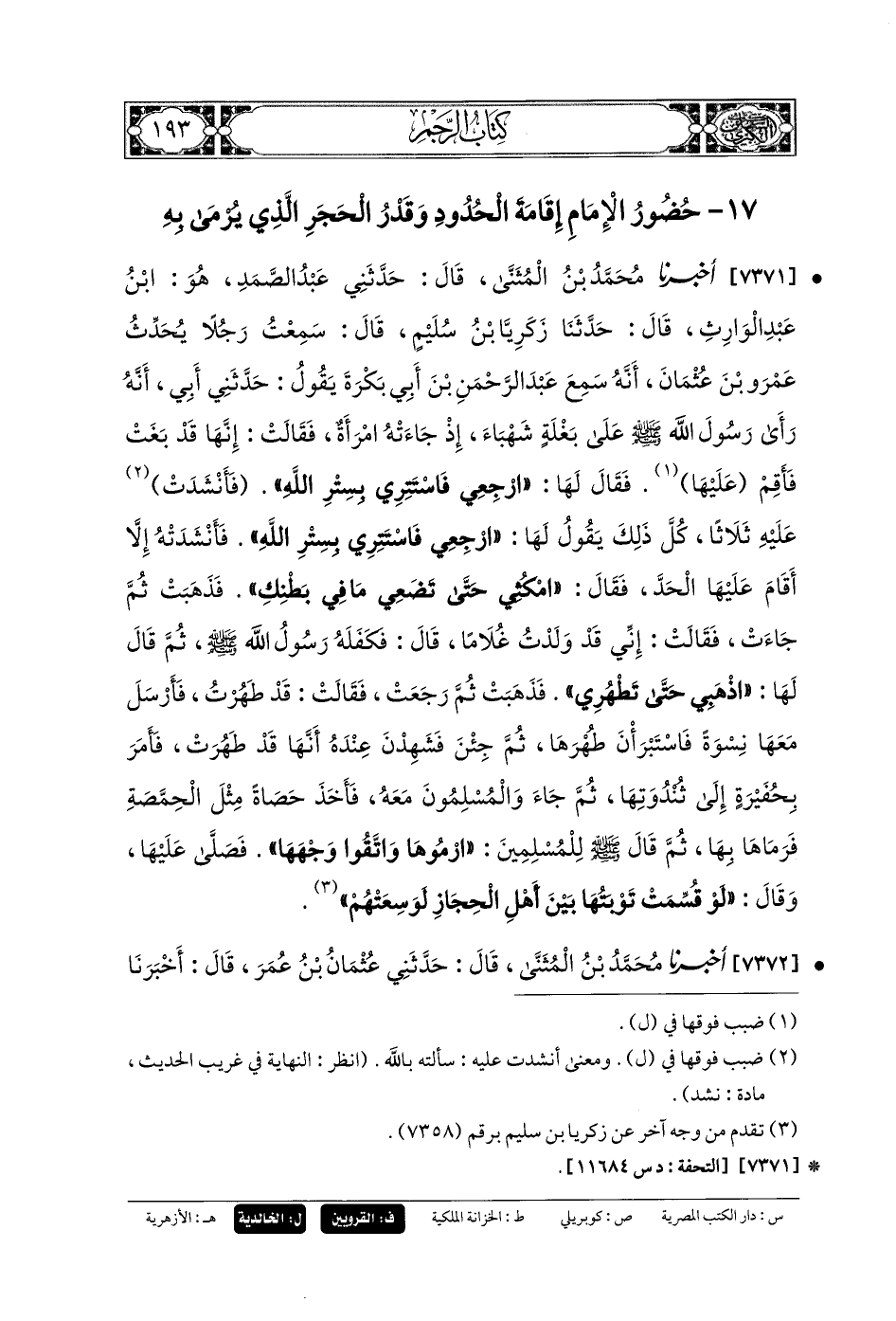 7371- أَخبَرنا مُحَمدُ بنُ المُثَنَّى، قَالَ: حَدَّثني عَبدُ الصَّمَدِ، هُوَ ابْنُ عَبدِ الوَارِثِ، قَالَ: حَدَّثنا زَكَرِيَّا بنُ سُلَيْمٍ، قَالَ: سَمِعْتُ رَجُلاً يُحَدِّثُ عَمْرَو بْنَ عُثْمَانَ، أَنَّهُ سَمِعَ عَبدَ الرَّحمَنِ بْنَ أَبي بَكْرَةَ يَقُولُ: حَدَّثني أَبي، أَنَّهُ رَأَى رَسُولَ اللهِ صَلى الله عَلَيهِ وسَلم عَلَى بَغْلَةٍ شَهْبَاءَ، إِذْ جَاءَتْهُ امْرَأَةٌ فَقَالَتْ، إِنَّهَا قَدْ بَغَتْ فَأَقِمْ عَلَيْهَا، فَقَالَ لَهَا: ارْجِعِي فَاسْتَتِرِي بِسِتْرِ اللهِ، فَأَنْشَدَتْ عَلَيْهِ ثَلاثًا كُلُّ ذَلِكَ يَقُولُ لَهَا: ارْجِعِي فَاسْتَتِرِي بِسِتْرِ اللهِ، فَأَنْشَدَتْهُ إِلاَّ أَقَامَ عَلَيْهَا الحَدَّ، فَقَالَ: امْكُثِي حَتَّى تَضَعِي مَا فِي بَطْنِكِ، فَذَهَبَتْ، ثُمَّ جَاءَتْ، فَقَالَتْ: إِنِّي قَدْ وَلَدَتْ غُلامًا، قَالَ: فَكَفَلَهُ رَسُولُ اللهِ صَلى الله عَلَيهِ وسَلم، ثُمَّ قَالَ لَهَا: اذْهَبِي حَتَّى تَطْهُرِي، فَذَهَبَتْ، ثُمَّ رَجَعَتْ، فَقَالَتْ: قَدْ طَهُرْتُ، فَأَرْسَلَ مَعَهَا نِسْوَةً فَاسْتَبْرَأْنَ طُهْرَهَا، ثُمَّ جِئْنَ فَشَهِدْنَ عِنْدَهُ أَنَّهَا قَدْ طَهُرَتْ، فَأَمَرَ بِحُفَيْرَةٍ إِلَى ثُنْدُوَتِهَا، ثُمَّ جَاءَ وَالمُسْلِمُونَ مَعَهُ، فَأَخَذَ حَصَاةً مِثْلَ الحِمَّصَةِ فَرَمَاهَا بِهَا، ثُمَّ قَالَ صَلى الله عَلَيهِ وسَلم لِلْمُسْلِمِينَ: ارْمُوهَا وَاتَّقُوا وَجْهَهَا، فَصَلَّى عَلَيْهَا وَقَالَ: لَوْ قُسِمَتْ تَوْبَتُهَا بَيْنَ أَهْلِ الحِجَازِ لَوَسِعَتْهُمْ.