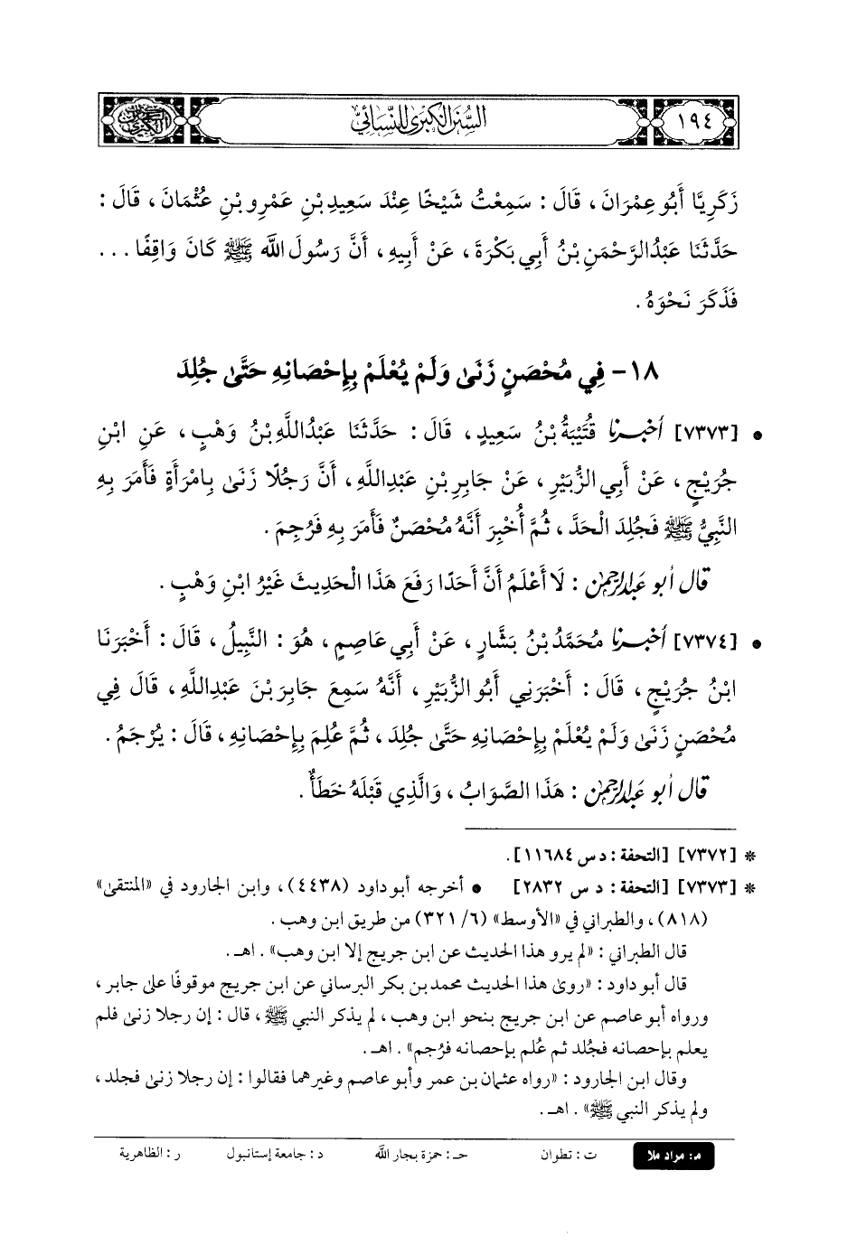 7373- أَخبَرنا قُتَيبَةُ بنُ سَعِيدٍ، قَالَ: حَدَّثنا عَبدُ اللهِ بنُ وَهْبٍ، عَنِ ابْنِ جُرَيْجٍ، عَن أَبي الزُّبَيْرِ، عَن جَابِرِ بنِ عَبدِ اللهِ، أَنَّ رَجُلاً زَنَا بِامْرَأَةٍ، فَأَمَرَ بِهِ النَّبيُّ صَلى الله عَلَيهِ وسَلم، فَجُلِدَ الحَدَّ، ثُمَّ أُخْبِرَ أَنَّهُ مُحْصَنٌ، فَأَمَرَ بِهِ فَرُجِمَ.