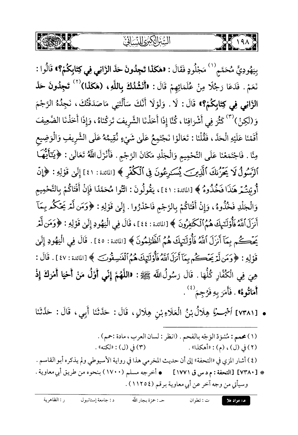 7381- أَخبَرنا هِلالُ بنُ العَلاءِ بنِ هِلالٍ، قَالَ: حَدَّثنا أَبي، قَالَ: حَدَّثنا عَبَّادُ بنُ العَوَّامِ، قَالَ: أَخبَرنا سُفيانُ بنُ حُسَيْنٍ، عَنِ الحَكَمِ، عَن مُجَاهِدٍ، عَنِ ابْنِ عَبَّاسٍ قَالَ: نُسِخَ مِنْ هَذِهِ السُّورَةِ، يَعْنِي آيَتَانِ، آيَةُ القَلائِدِ، وَقَوْلُهُ: {فَإِنْ جَاؤوكَ فَاحْكُمْ بَيْنَهُمْ أَوْ أَعْرِضْ عَنهُمْ} رَدَّهُمْ إِلَى حُكَّامِهِمْ، حَتَّى نَزَلَتْ: {وَأَنِ احْكُمْ بَيْنَهُمْ بِمَا أَنْزَلَ اللهُ} قَالَ: فَأُمِرَ رَسُولُ اللهِ صَلى الله عَلَيهِ وسَلم، أَنْ يَحْكُمَ بَيْنَهُمْ بِمَا أَنْزَلَ اللهُ.