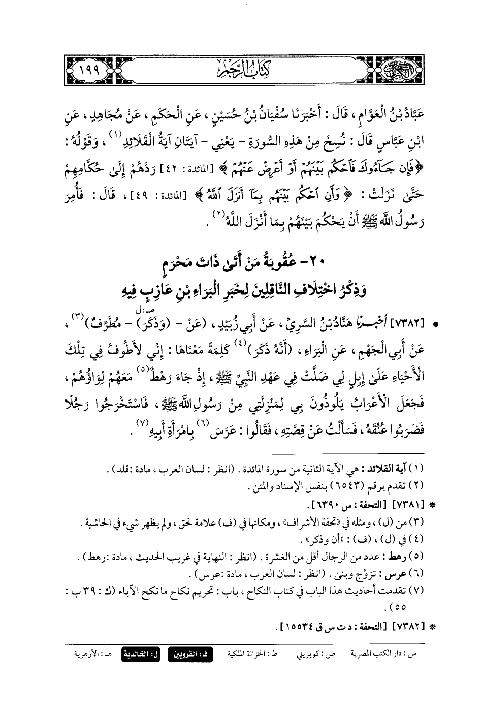 7382- أَخبَرنا هَنَّادُ بنُ السَّرِيِّ، عَن أَبي زُبَيْدٍ، عَن، وَذَكَرَ، مُطَرِّفٍ، عَن أَبي الجَهْمِ، عَنِ البَرَاءِ أَنَّهُ ذَكَرَ كَلِمَةً مَعْنَاهَا، إِنِّي لأَطُوفُ فِي تِلْكِ الأَحْيَاءِ عَلَى إِبِلٍ لِي ضَلَّتْ فِي عَهْدِ النَّبيِّ صَلى الله عَلَيهِ وسَلم، إِذْ جَاءَ رَهْطٌ مَعَهُمْ لِوَاؤُهُمْ، فَجَعَلَ الأَعْرَابُ يَلُوذُونَ بِي لِمَنْزِلَتِي مِنْ رَسُولِ اللهِ صَلى الله عَلَيهِ وسَلم، فَاسْتَخْرَجُوا رَجُلاً فَضَرَبُوا عُنُقَهُ، فَسَأَلْتُ عَن قِصَّتِهِ، فَقَالُوا: عَرَّسَ بِامْرَأَةِ أَبيهِ.