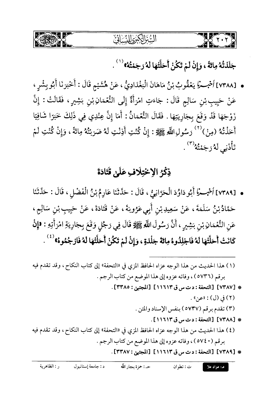 7389- أَخبَرنا أَبو دَاوُدَ الحَرَّانِيُّ، قَالَ: حَدَّثنا عَارِمُ بنُ الفَضْلِ، قَالَ: حَدَّثنا حَمَّادُ بنُ سَلَمَةَ، عَن سَعِيدِ بنِ أَبي عَرُوبَةَ، عَن قَتَادَةَ، عَن حَبِيبِ بنِ سَالِمٍ، عَنِ النُّعْمَانِ بنِ بَشِيرٍ، أَنَّ رَسُولَ اللهِ صَلى الله عَلَيهِ وسَلم قَالَ: فِي رَجُلٍ وَقَعَ بِجَارِيَةِ امْرَأَتِهِ: إِنْ كَانَتْ أَحَلَّتْهَا لَهُ فَاجْلِدُوهُ مِئَةَ جَلْدَةٍ، وَإِنْ لَمْ تَكُنْ أَحَلَّتْهَا لَهُ فَارْجُمُوهُ.