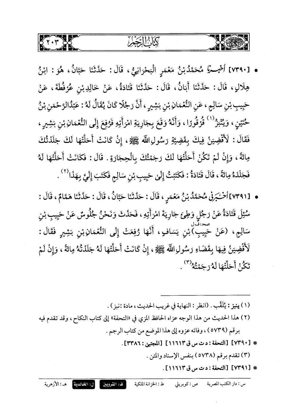 7390- أَخبَرنا مُحَمدُ بنُ مَعْمَرٍ البَحْرَانِيُّ، قَالَ: حَدَّثنا حَبَّانُ، هُوَ ابْنُ هِلالٍ، قَالَ: حَدَّثنا أَبَانُ، قَالَ: حَدَّثنا قَتَادَةُ، عَن خَالِدِ بنِ عُرْفُطَةَ، عَن حَبِيبِ بنِ سَالِمٍ، عَنِ النُّعْمَانِ بنِ بَشِيرٍ، أَنَّ رَجُلاً كَانَ يُقَالُ لَهُ: عَبدُ الرَّحمَنِ بنُ حُنَيْنٍ وَيُنْبَزُ قُرْقُورًا، وَأَنَّهُ وَقَعَ بِجَارِيَةِ امْرَأَتِهِ، فَرُفِعَ إِلَى النُّعْمَانِ بنِ بَشِيرٍ، فَقَالَ: لأَقْضِيَنَّ فِيكَ بِقَضِيَّةِ رَسُولِ اللهِ صَلى الله عَلَيهِ وسَلم: إِنْ كَانَتْ أَحَلَّتْهَا لَكَ جَلَدْتُكَ مِئَةً، وَإِنْ لَمْ تَكُنْ أَحَلَّتْهَا لَكَ رَجَمْتُكَ بِالحِجَارَةِ، قَالَ: فَكَانَتْ أَحَلَّتْهَا لَهُ فَجَلَدَهُ مِئَةً، قَالَ قَتَادَةُ: فَكَتَبْتُ إِلَى حَبِيبِ بنِ سَالِمٍ، فَكَتَبَ إِلَيَّ بِهَذَا.