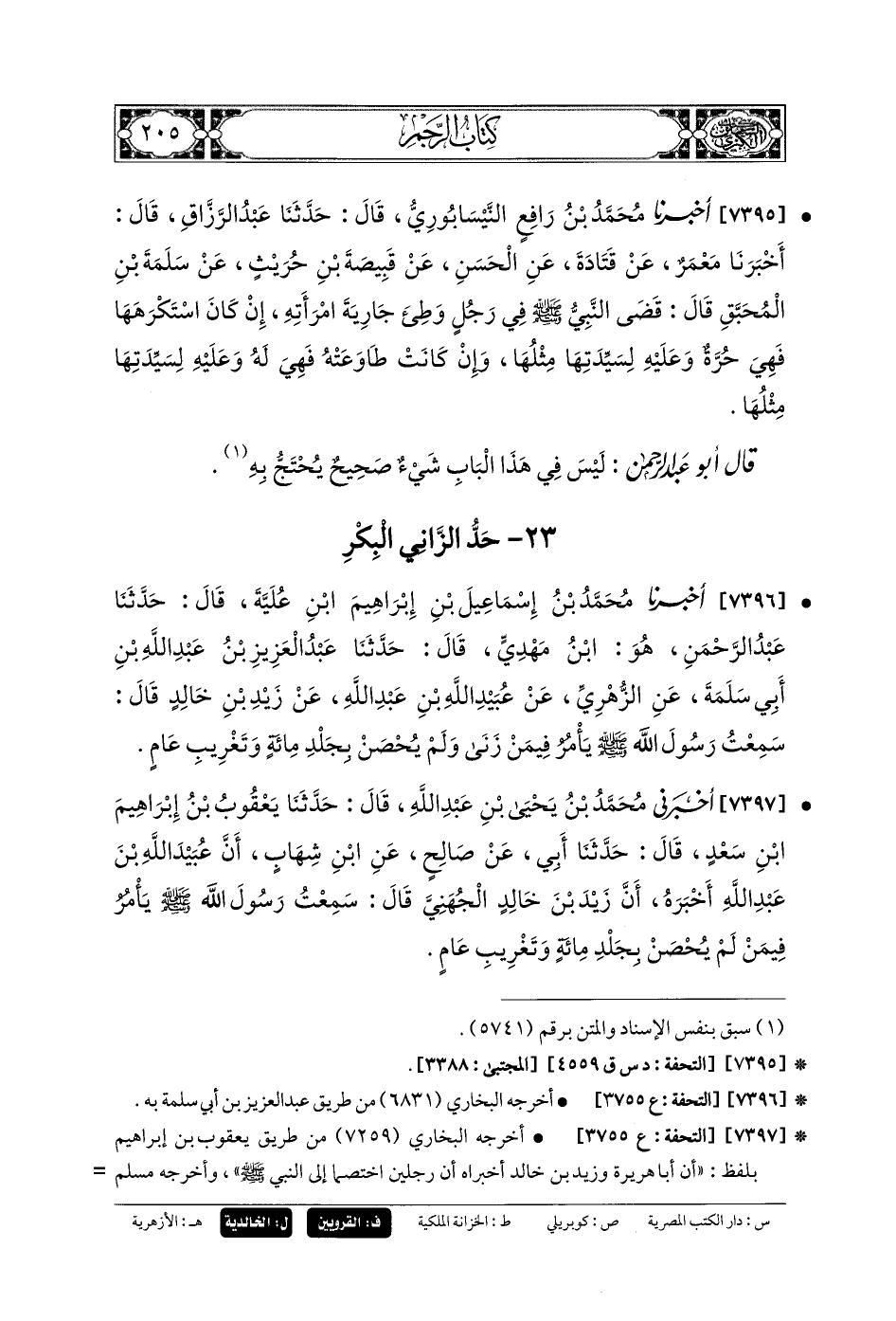 7397- أَخْبَرَنِي مُحَمدُ بنُ يَحْيَى بنِ عَبدِ اللهِ، قَالَ: حَدَّثنا يَعْقُوبُ بنُ إِبْرَاهِيمَ بنِ سَعْدٍ، قَالَ: حَدَّثنا أَبي، عَن صَالِحٍ، عَنِ ابْنِ شِهَابٍ، أَنَّ عُبَيْدَ اللهِ بْنَ عَبدِ اللهِ أَخْبَرَهُ؛ أَنَّ زَيْدَ بْنَ خَالِدٍ الجُهَنِيَّ، قَالَ: سَمِعْتُ رَسُولَ اللهِ صَلى الله عَلَيهِ وسَلم يَأْمُرُ فِيمَنْ لَمْ يُحْصَنْ بِجَلْدِ مِئَةٍ وَتَغْرِيبِ عَامٍ.