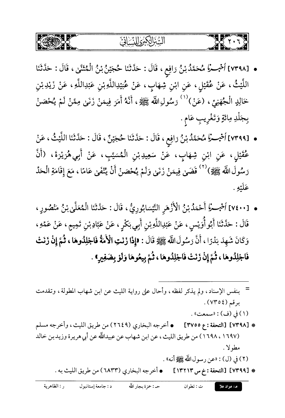 7400- أَخبَرنا أَحْمَدُ بنُ الأَزْهَرِ النَّيْسَابُورِيُّ، قَالَ: حَدَّثنا المُعَلَّى بنُ مَنْصُورٍ، قَالَ: حَدَّثنا أَبو أُوَيْسٍ، عَن عَبدِ اللهِ بنِ أَبي بَكْرٍ، عَن عَبَّادِ بنِ تَمِيمٍ، عَن عَمِّهِ، وَكَانَ شَهِدَ بَدْرًا، أَنَّ رَسُولَ اللهِ صَلى الله عَلَيهِ وسَلم قَالَ: إِذَا زَنَتِ الأَمَةُ فَاجْلِدُوهَا، ثُمَّ إِنْ زَنَتْ فَاجْلِدُوهَا، ثُمَّ إِنْ زَنَتْ فَاجْلِدُوهَا، ثُمَّ بِيعُوهَا وَلَوْ بِضَفِيرٍ.
