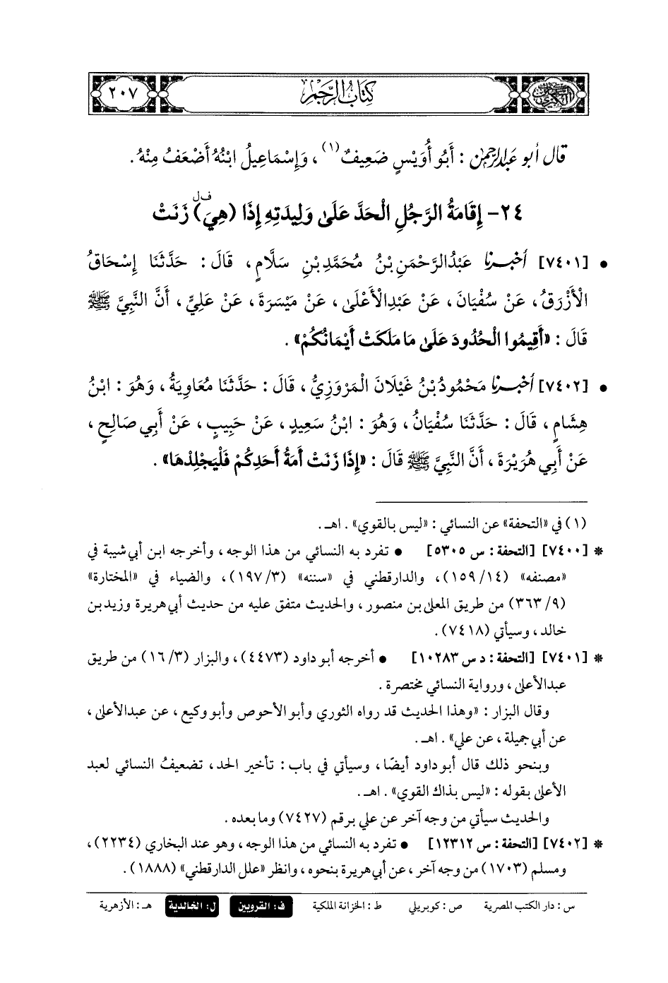 7401- أَخبَرنا عَبدُ الرَّحمَنِ بنُ مُحَمدِ بنِ سَلاَّمٍ، قَالَ: حَدَّثنا إِسحَاقُ الأَزْرَقُ، عَن سُفيانَ، عَن عَبدِ الأَعْلَى، عَن مَيْسَرَةَ، عَن عَليٍّ، أَنَّ النَّبيَّ صَلى الله عَلَيهِ وسَلم قَالَ: أَقِيمُوا الحُدُودَ عَلَى مَا مَلَكَتْ أَيْمَانُكُمْ.
