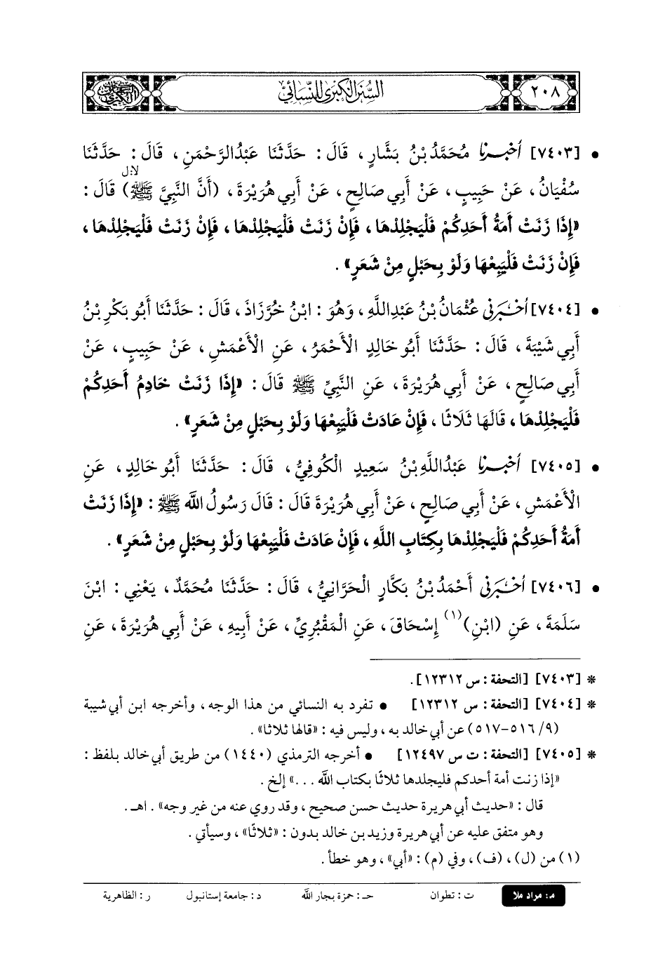 7406 - أَخْبَرَنِي أَحْمَدُ بنُ بَكَّارٍ الحَرَّانِيُّ، قَالَ: حَدَّثنا مُحَمدٌ، يَعْنِي ابْنَ سَلَمَةَ، عَنِ ابْنِ إِسحَاقَ، عَنِ المَقْبُرِيِّ، عَن أَبيهِ، عَن أَبي هُرَيْرَةَ، عَنِ النَّبيِّ صَلى الله عَلَيهِ وسَلم قَالَ: إِذَا زَنَتْ أَمَةُ أَحَدِكُمْ فَلْيَجْلِدْهَا.