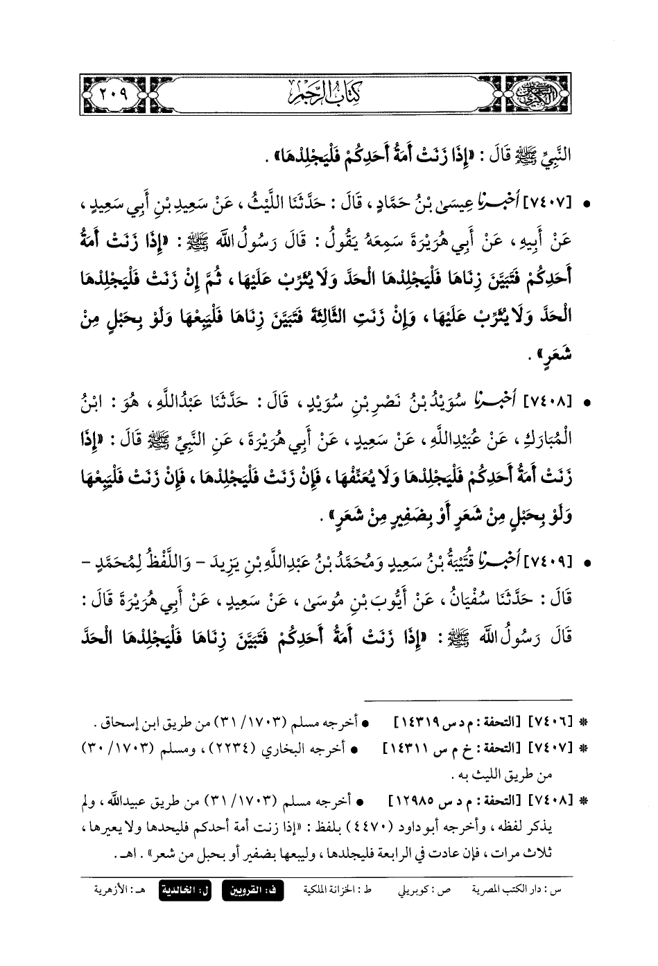 7407- أَخبَرنا عِيسَى بنُ حَمَّادٍ، قَالَ: حَدَّثنا اللَّيْثُ، عَن سَعِيدِ بنِ أَبي سَعِيدٍ، عَن أَبيهِ، عَن أَبي هُرَيْرَةَ، سَمِعَهُ يَقُولُ: قَالَ رَسُولُ اللهِ صَلى الله عَلَيهِ وسَلم قَالَ: إِذَا زَنَتْ أَمَةُ أَحَدِكُمْ فَتَبَيَّنَ زِنَاهَا، فَلْيَجْلِدْهَا الحَدَّ وَلا يُثَرِّبْ عَلَيْهَا، ثُمَّ إِنْ زَنَتْ فَلْيَجْلِدْهَا الحَدَّ وَلا يُثَرِّبْ عَلَيْهَا، وَإِنْ زَنَتِ الثَّالِثَةَ فَتَبَيَّنَ زِنَاهَا، فَلْيَبِعْهَا وَلَوْ بِحَبْلٍ مِنْ شَعْرٍ.
