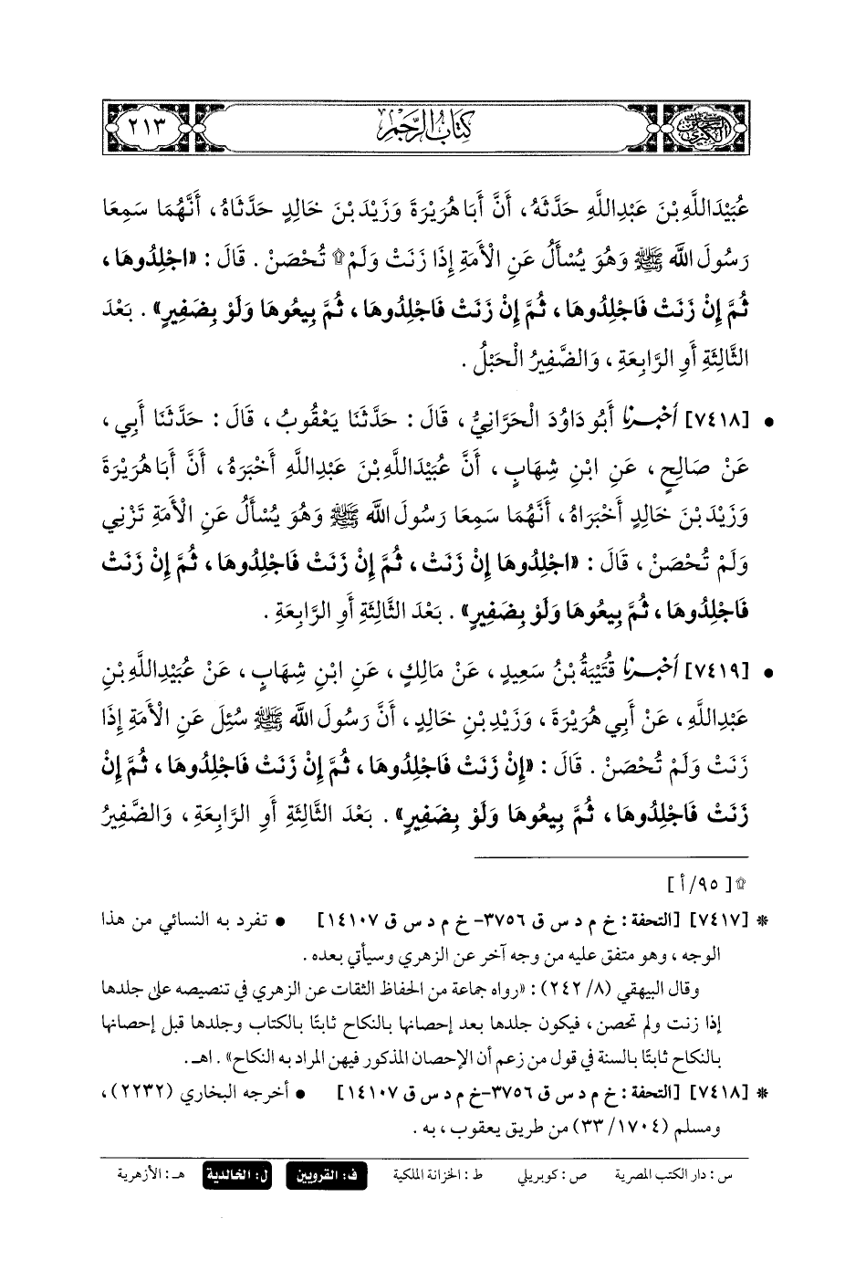 7419- أَخبَرنا قُتَيبَةُ بنُ سَعِيدٍ، عَن مَالِكٍ، عَنِ ابْنِ شِهَابٍ، عَن عُبَيْدِ اللهِ بنِ عَبدِ اللهِ، عَن أَبي هُرَيْرَةَ، وَزَيْدِ بنِ خَالِدٍ، أَنَّ رَسُولَ اللهِ صَلى الله عَلَيهِ وسَلم سُئِلَ عَنِ الأَمَةِ إِذَا زَنَتْ وَلَمْ تُحْصَنْ، قَالَ: إِنْ زَنَتْ فَاجْلِدُوهَا، ثُمَّ إِنْ زَنَتْ فَاجْلِدُوهَا، ثُمَّ إِنْ زَنَتْ فَاجْلِدُوهَا، ثُمَّ بِيعُوهَا وَلَوْ بِضَفِيرٍ، بَعْدَ الثَّالِثَةِ أَوِ الرَّابِعَةِ، وَالضَّفِيرُ: الحَبْلُ.